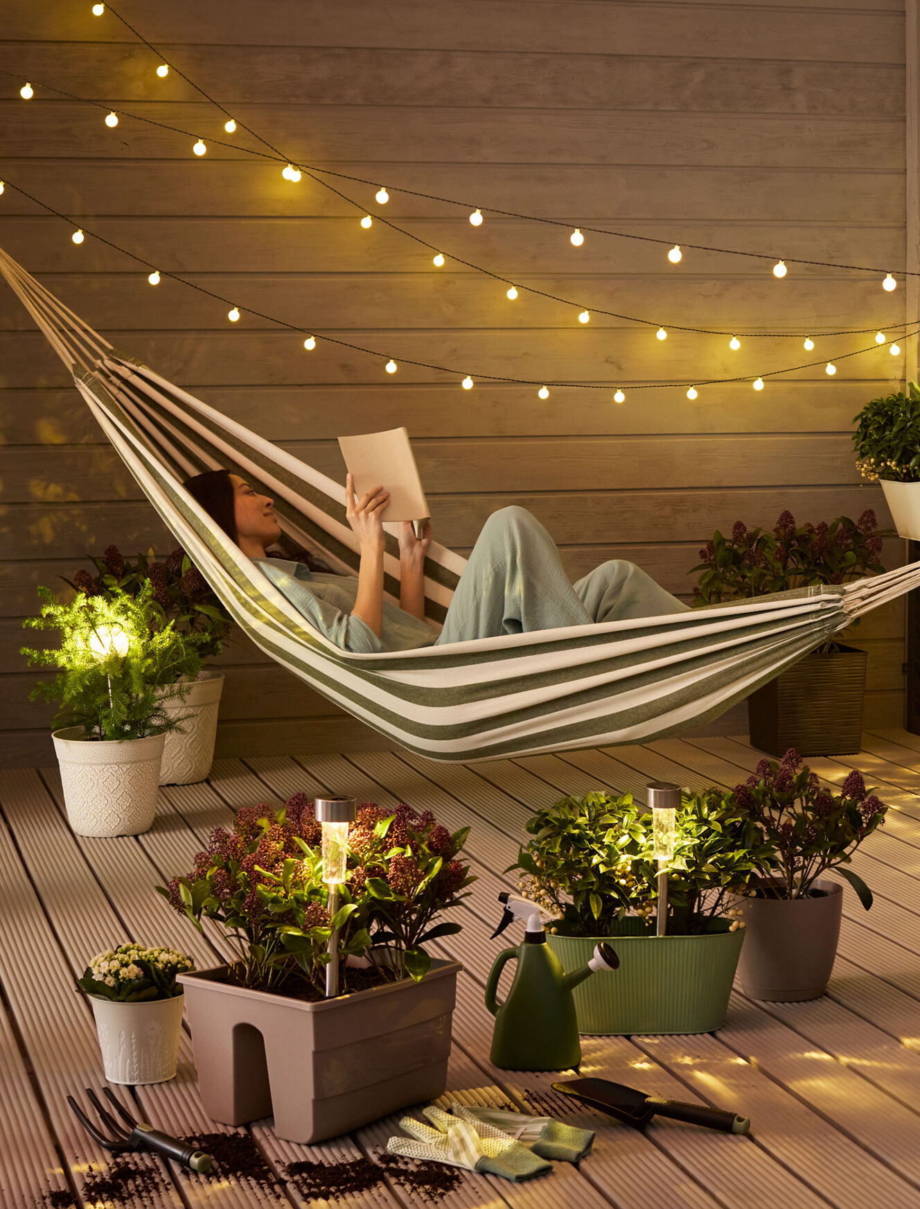 - Guirnaldas: las guirnaldasluminosas colgadas en las paredes, alrededor de las ventanas o encima de la cama harán que el ambiente adquiera un poco de magia. También puedes colgarlas por fuera, creando una iluminación de fantasía en la terraza o el jardín.