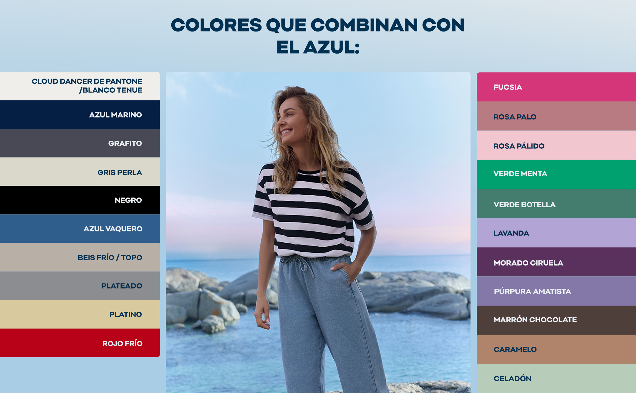 - Iluminación del atuendo: muchos tonos de azul tienen la capacidad de iluminar otros colores, lo que resulta especialmente útil en la temporada de entretiempo o cuando salimos del gris invernal.