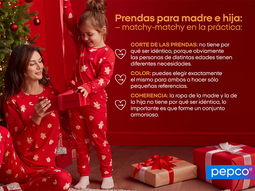 Los cojuntos navideños tienen un encanto especial. Brillan con lentejuelas y suelen presentar motivos típicos de la temporada, como hombres de jengibre, bastones de caramelo, árboles de Navidad y renos. El acabado de peluche blanco recuerda a la nieve suave o al abrigo de Papá Noel, los elementos rojos se asocian con la calidez del hogar, y el verde apagado hace pensar en un árbol que huele a bosque. A la hora de elegir ropa para madre e hijos, ten en cuenta el estilo de cada uno y elige las prendas que mejor os vayan. Incluye a tu hija o hijo en estas reflexiones y planes. Será una forma de pasar un rato muy agradable juntos.