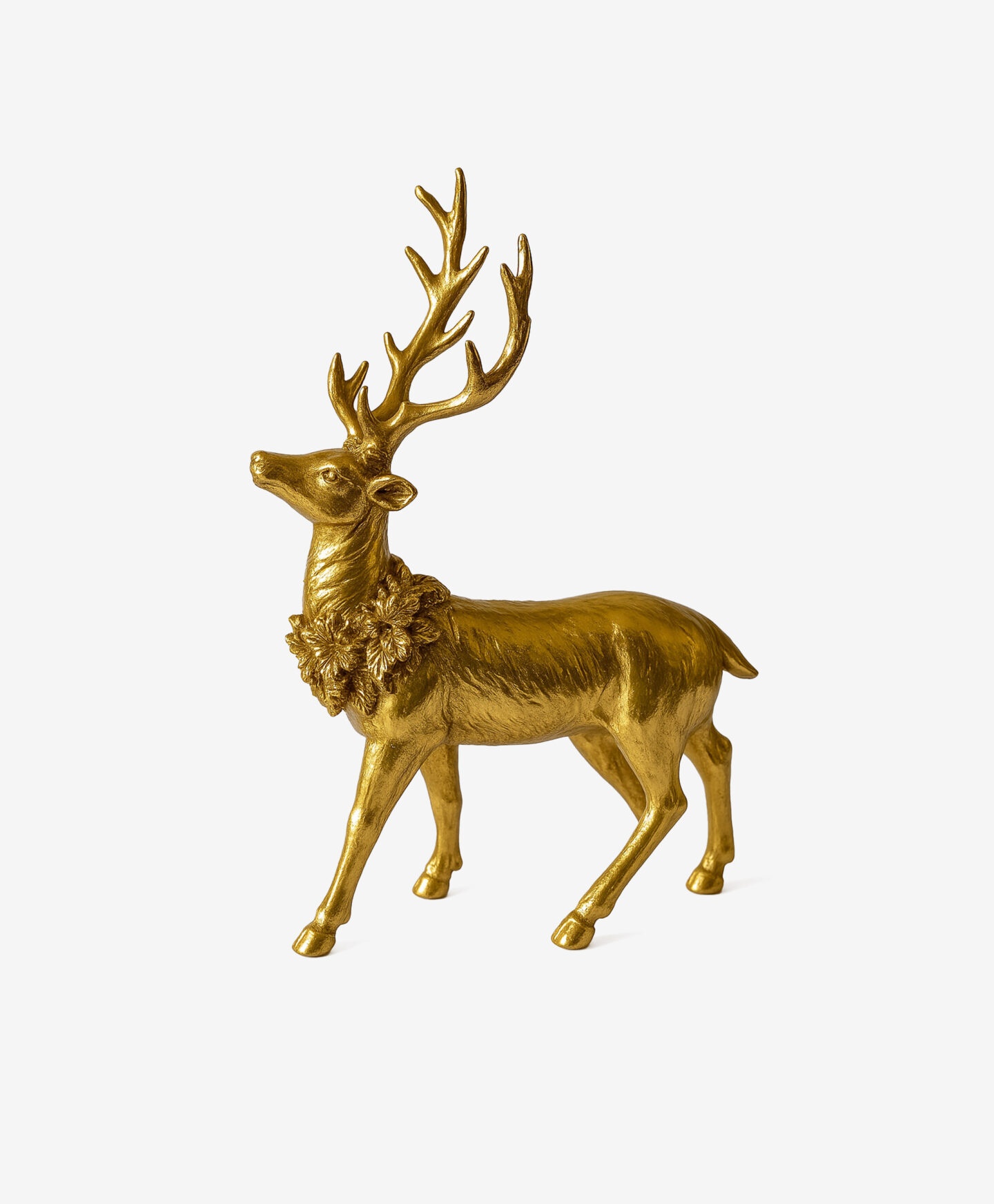 El adorno ciervo dorado es un clásico con un toque moderno. El brillo realza cada detalle y la corona le da un aire festivo. Una pieza elegante que aporta majestuosidad invernal y se convierte en el centro de tu decoración.