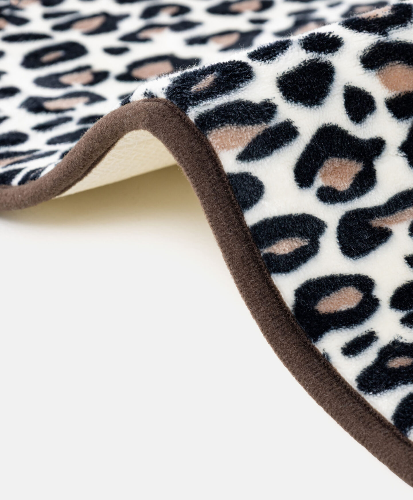 La alfombra con estampado aporta un toque salvaje y moderno al baño. Su diseño inspirado en la naturaleza crea un contraste visual único y lleno de estilo.