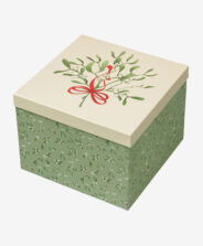 La caja de cartón verde cuenta con un estampado decorativo de aire navideño. Es práctica y bonita, ideal para envolver sorpresas para familiares o amigos. Los regalos en este tipo de caja lucen de forma excepcional y transmiten alegría desde el primer vistazo.