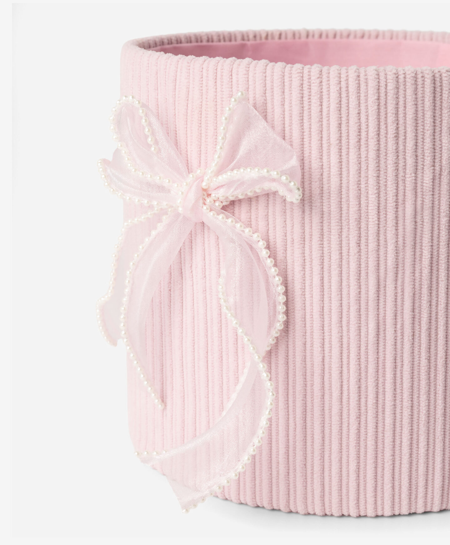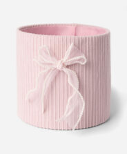 La caja redonda pequeña con lazo es un complemento sutil para cualquier estancia. Es ideal para guardar joyas, llaves u otros pequeños objetos, o como elemento decorativo. Al no tener tapa, permite un acceso rápido al contenido. Su diseño permite colocarla tanto en el dormitorio como en el escritorio.