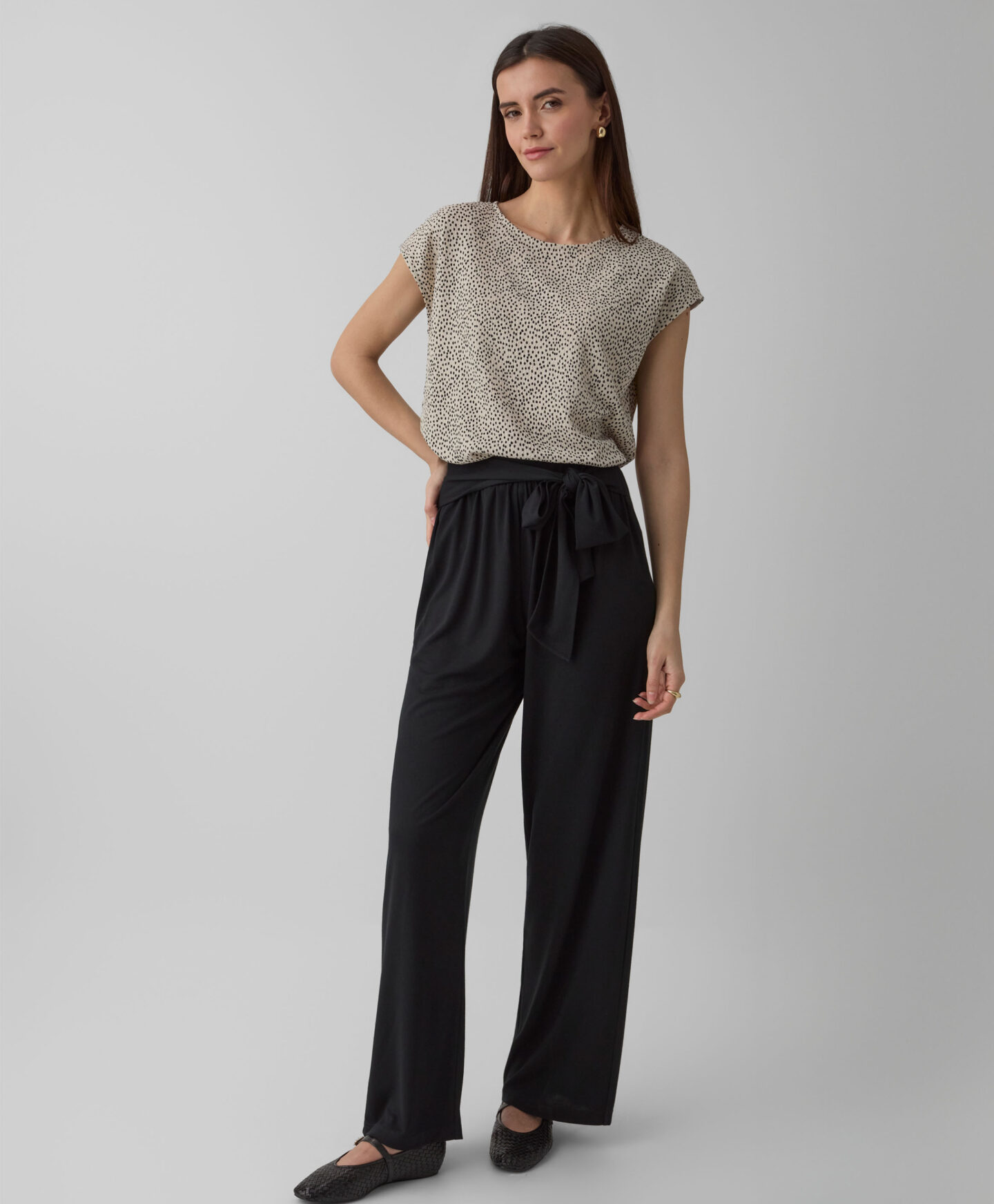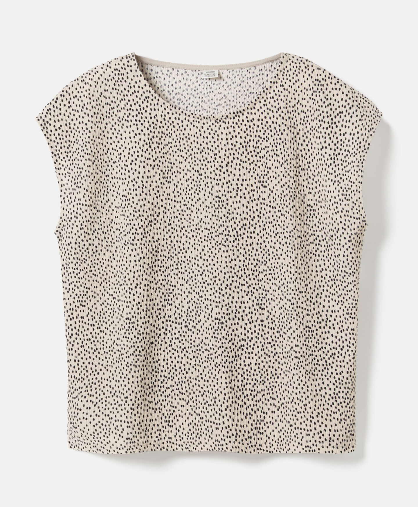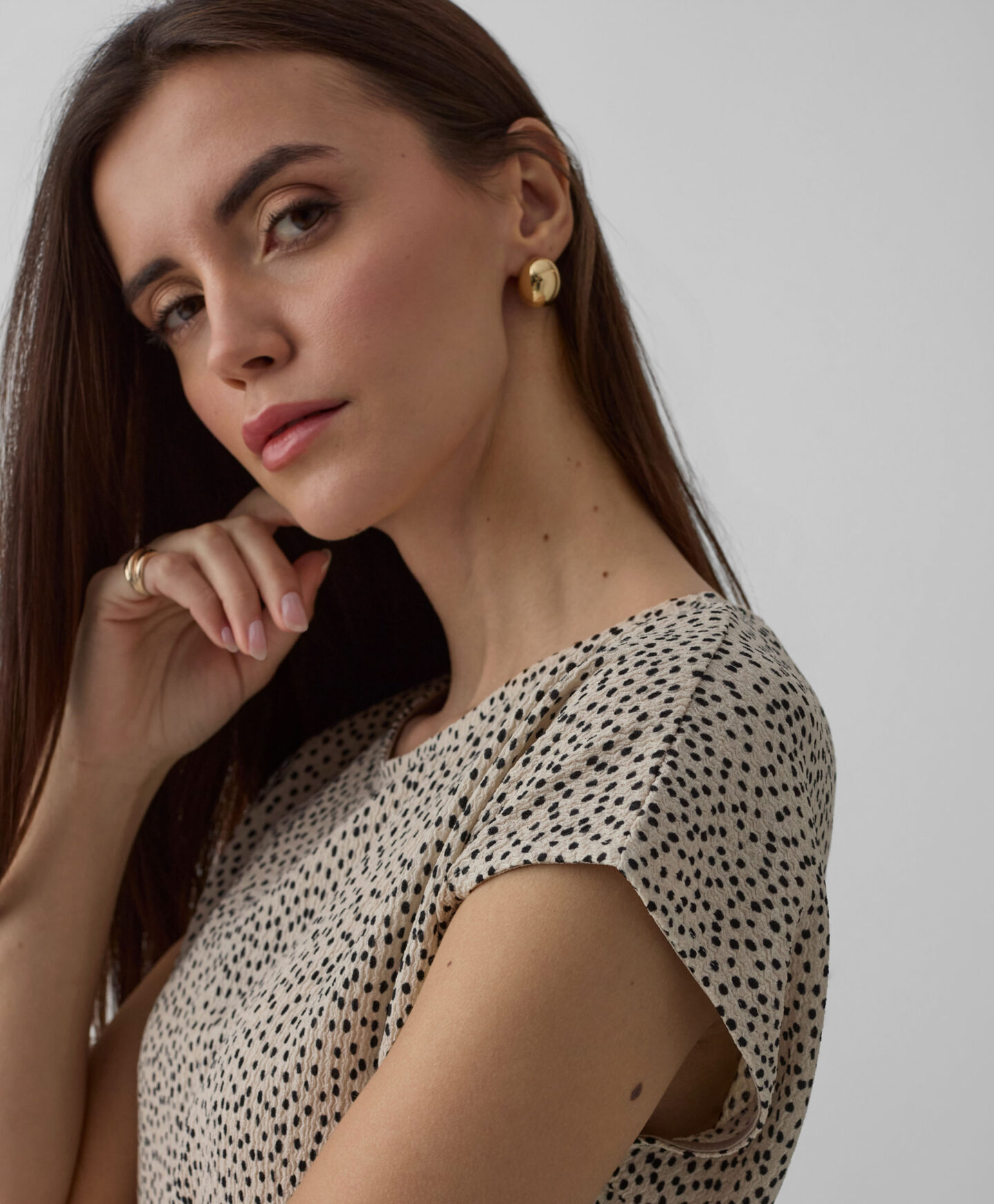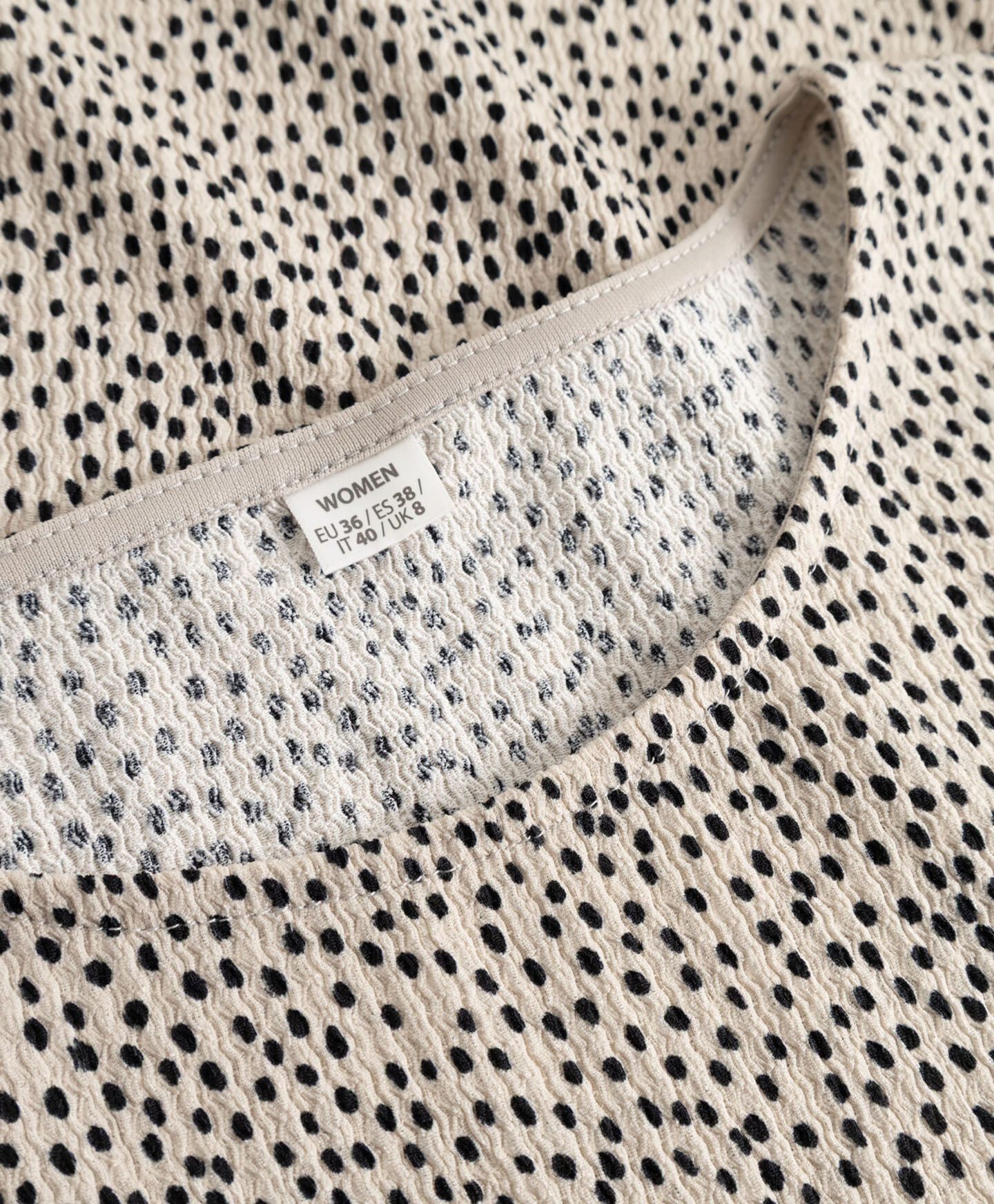 La camisa beige con textura arrugada y estampado combina con la falda de la colección o con vaqueros y pantalones más formales. La manga corta la hace ideal para entretiempo y funciona tanto con chaqueta clásica como con cárdigan liso.