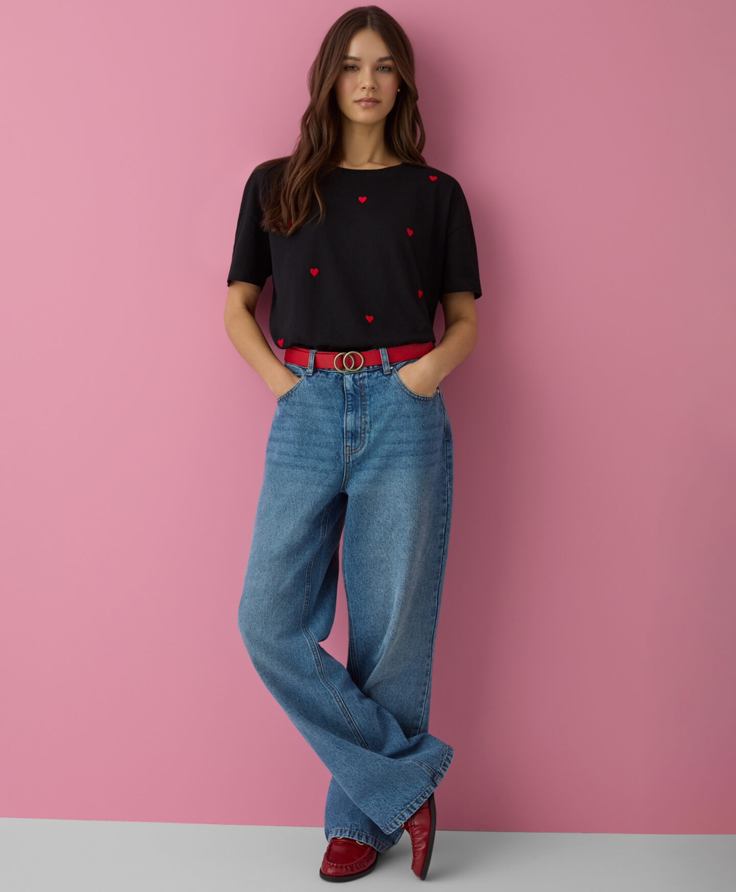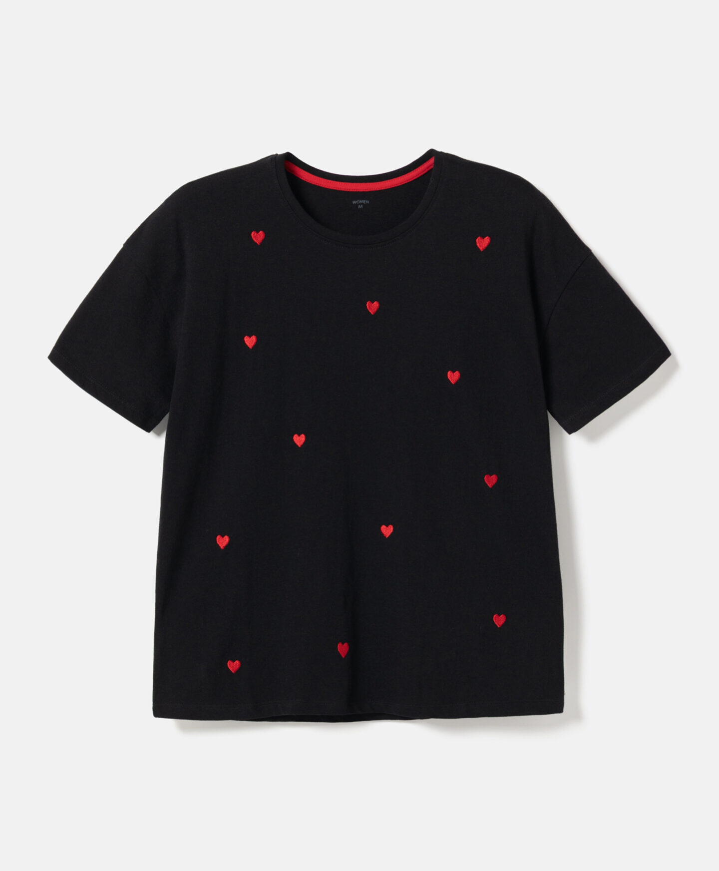 La camiseta 100% algodón con corazones está diseñada para priorizar la comodidad. Presenta corte clásico y un estampado con encanto. Además, el tejido es suave y agradable para el uso diario.