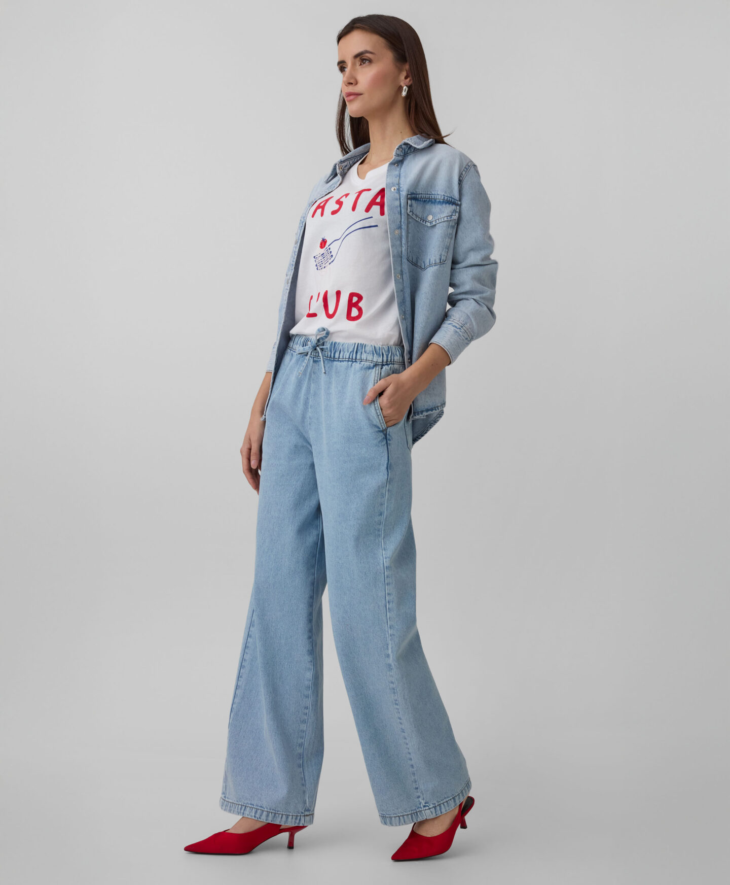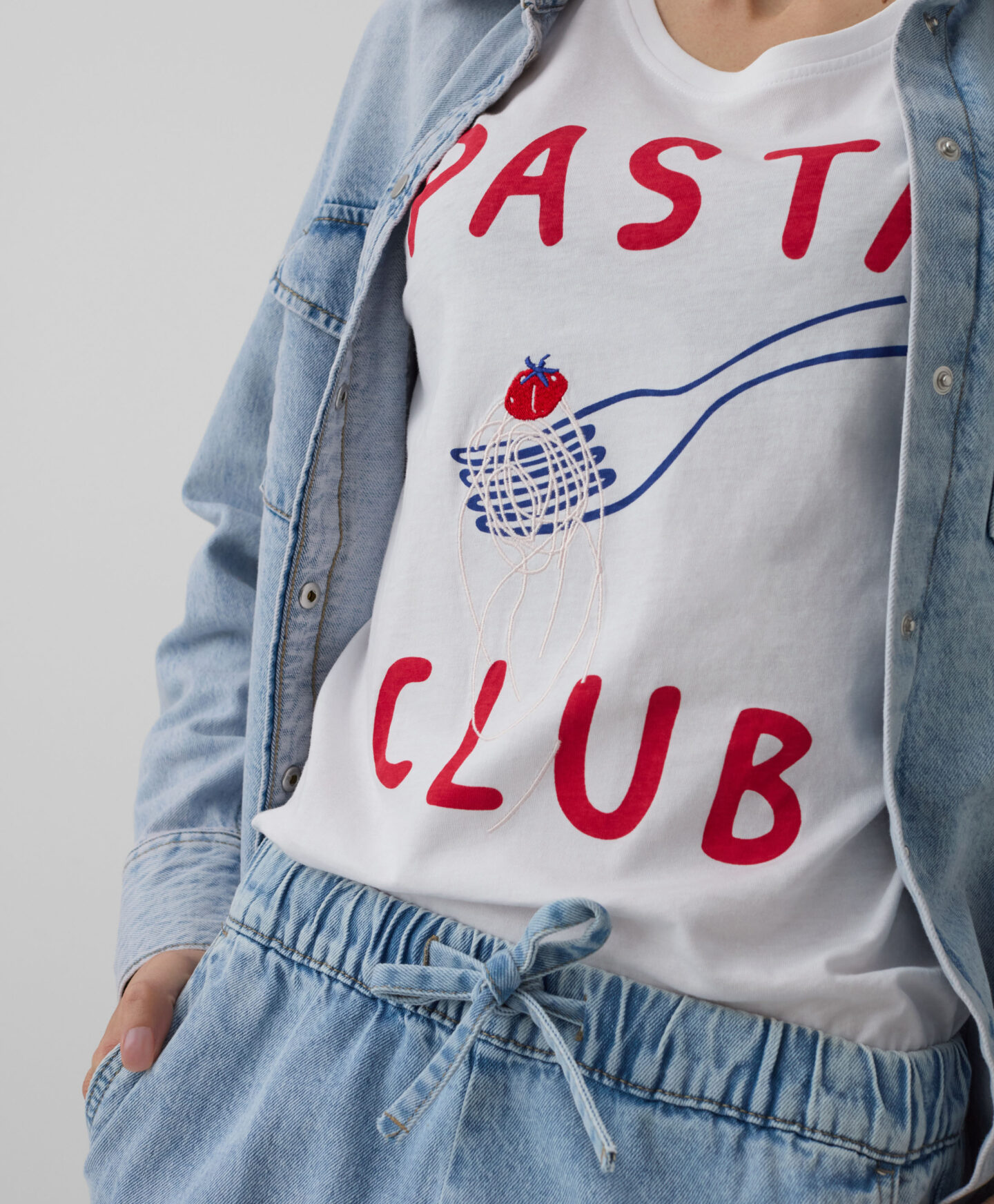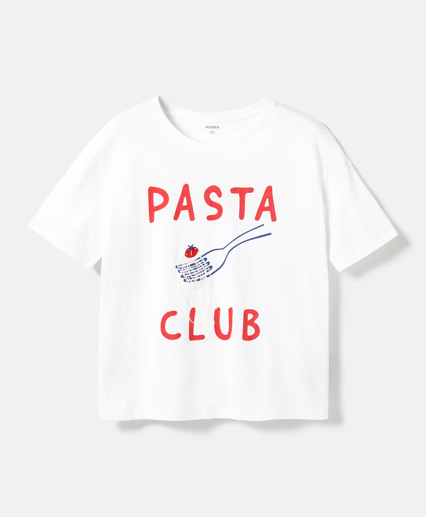 La camiseta 100% algodón con gráfico de pasta destaca por su diseño original. El estampado frontal aporta personalidad y combina fácilmente con vaqueros para crear un look versátil ideal para el día a día.