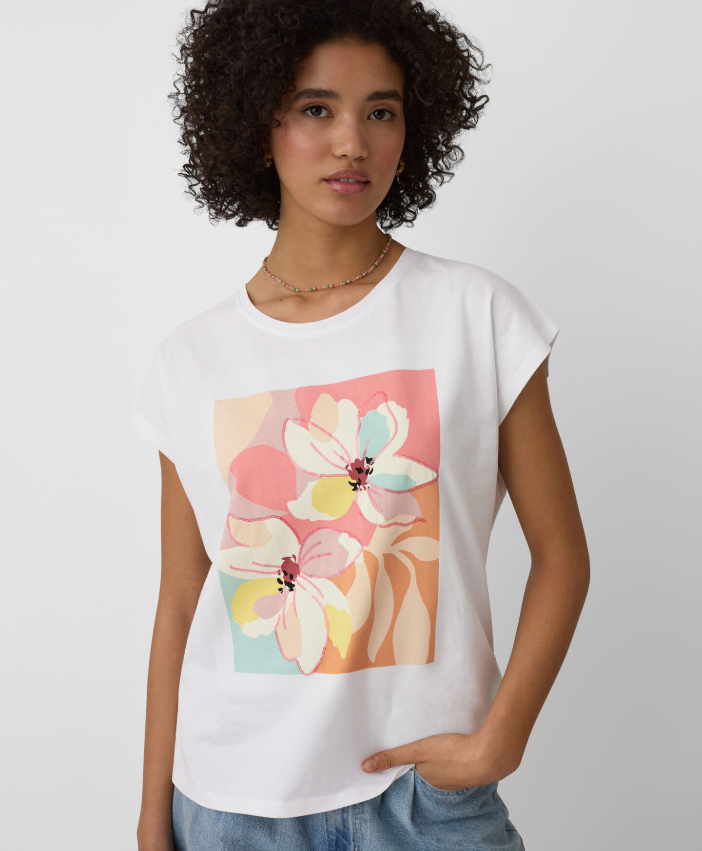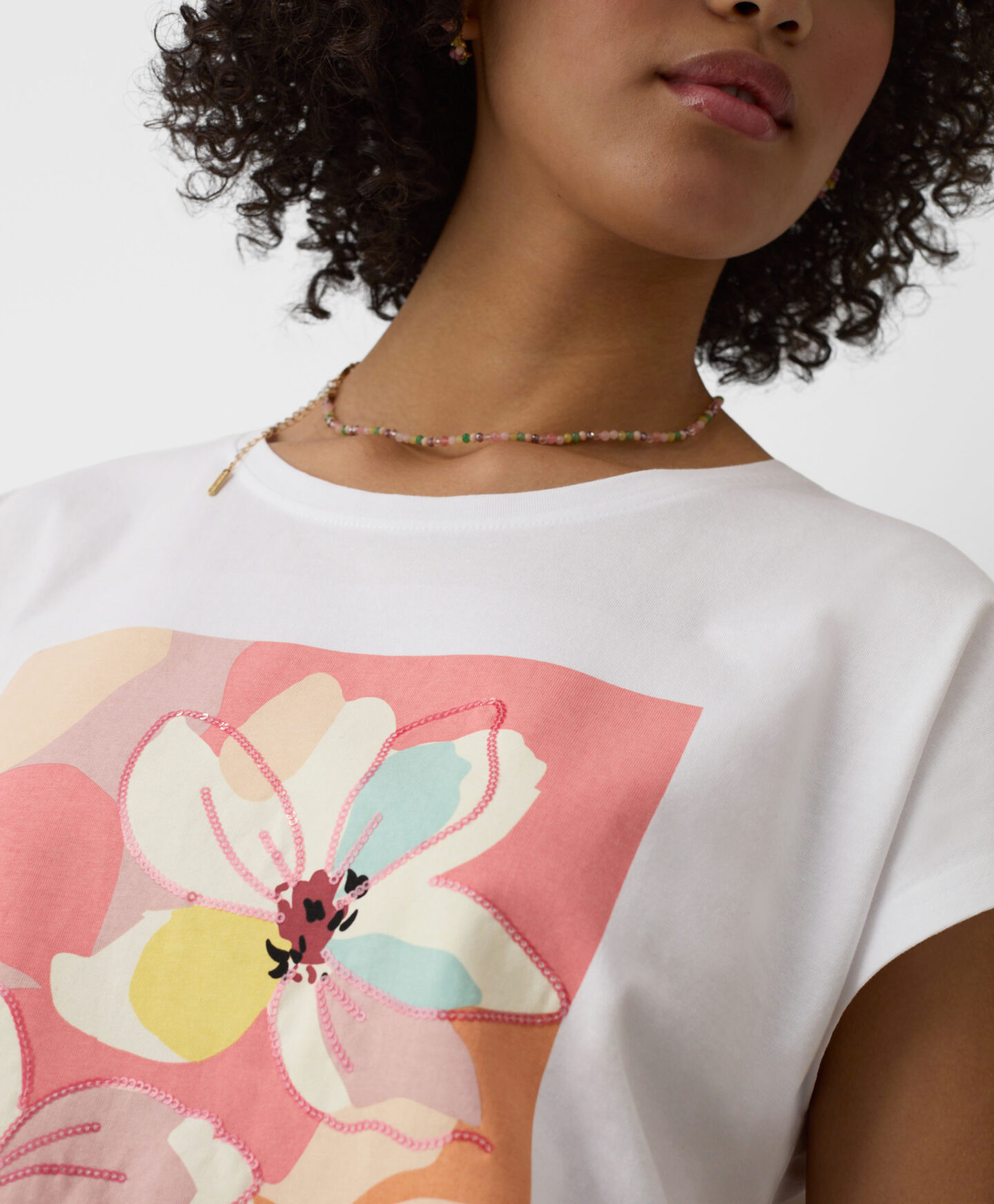 La camiseta con alto contenido en algodón y toque de elastano se adapta cómodamente al cuerpo. El gráfico floral con detalles de lentejuelas aporta un acabado llamativo. Es ligera, transpirable y cómoda. Combina fácilmente con vaquero, pantalón deportivo o pantalón más elegante.