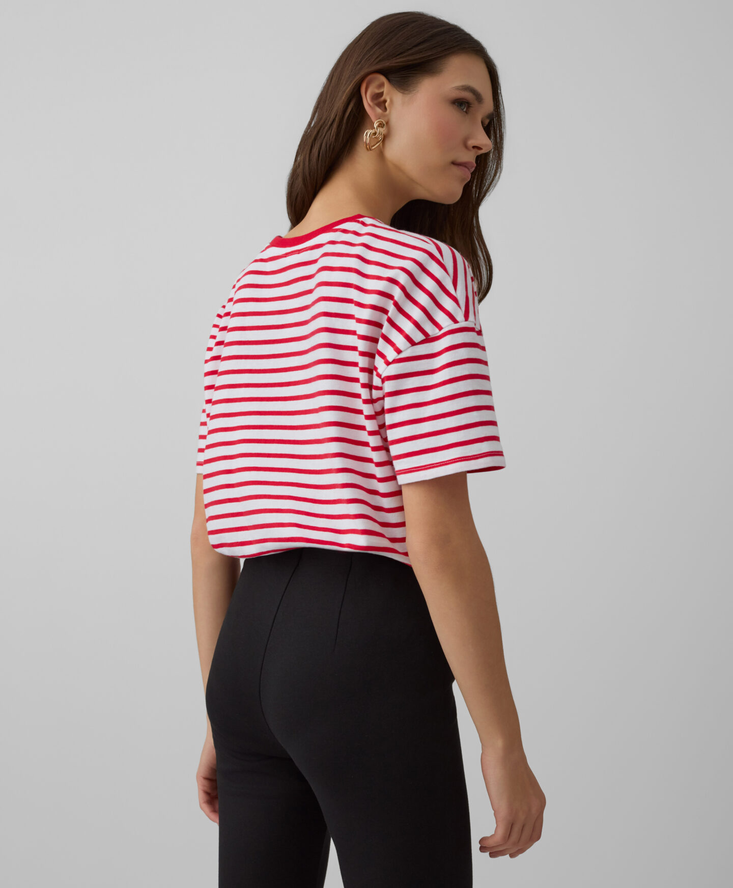 La camiseta a rayas 100% algodón de manga corta une comodidad y estilo actual. Resulta perfecta para combinar en distintos looks. Además, el tejido es transpirable y agradable para la piel.