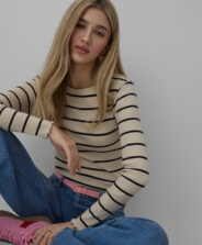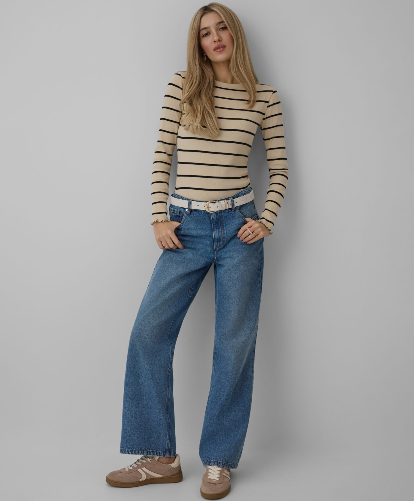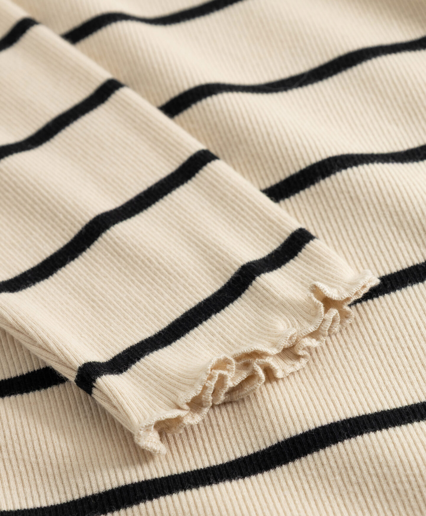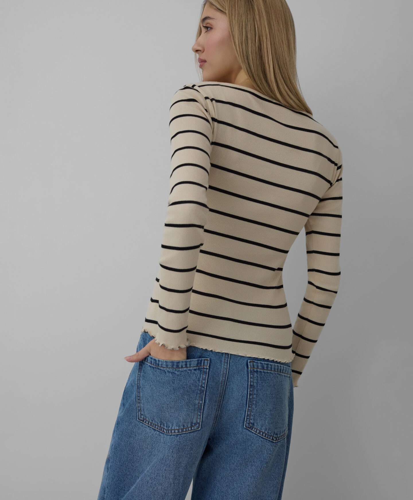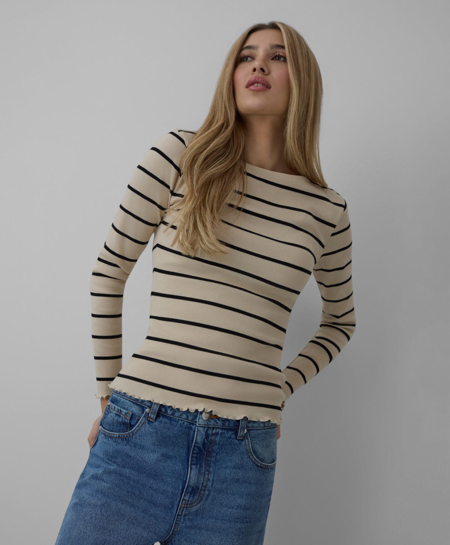 La camiseta beige a rayas con alto contenido en algodón y un toque de elastano se adapta bien a la silueta. El acabado decorativo añade un detalle estiloso. Combina con vaqueros y también con pantalones de vestir. Disponible en dos colores.