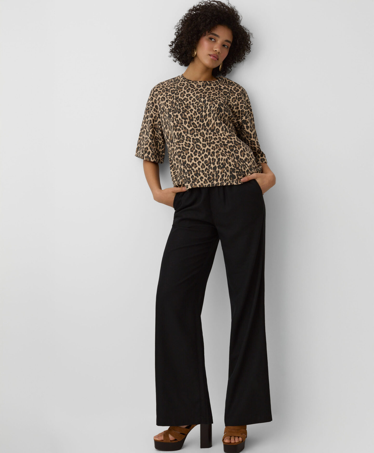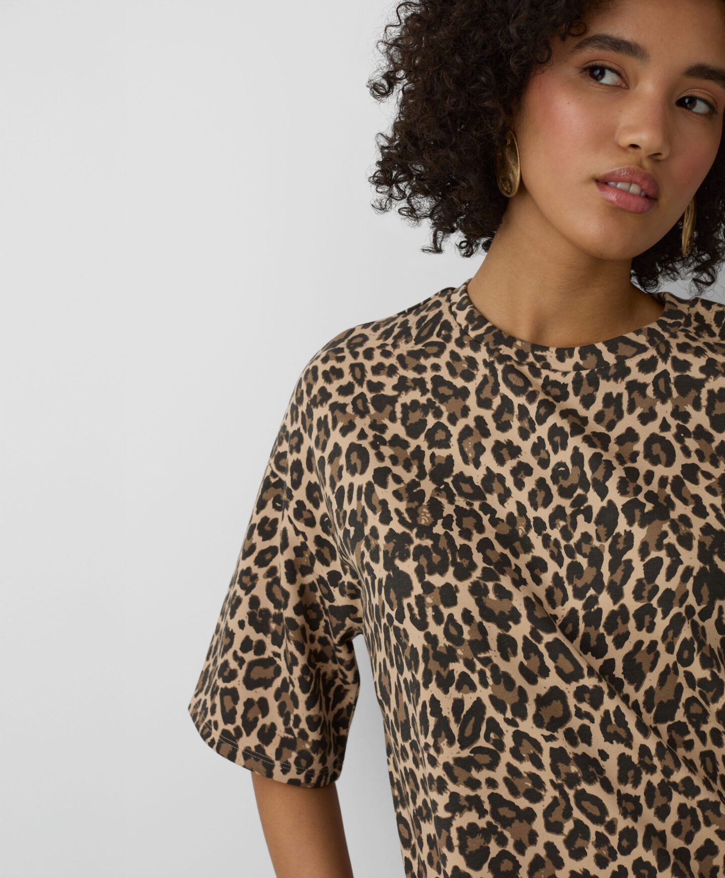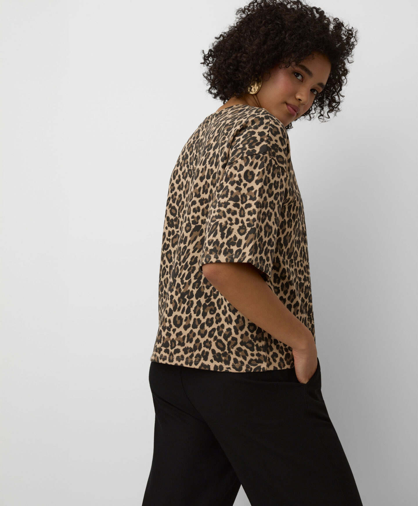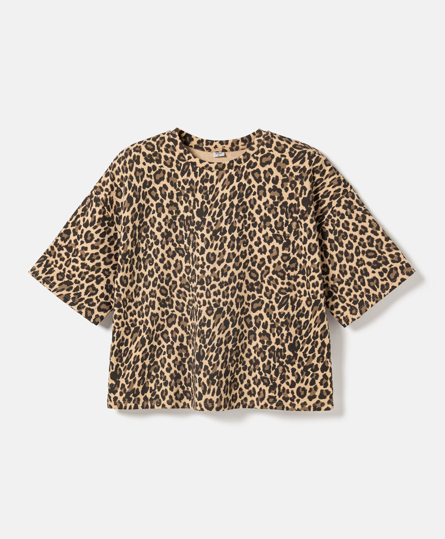La camiseta con estampado de leopardo es perfecta para quienes buscan un look con personalidad. El corte más corto y holgado encaja con estilos casuales. Combina fácilmente con pantalón biker, pantalón corto amplio o vaquero.