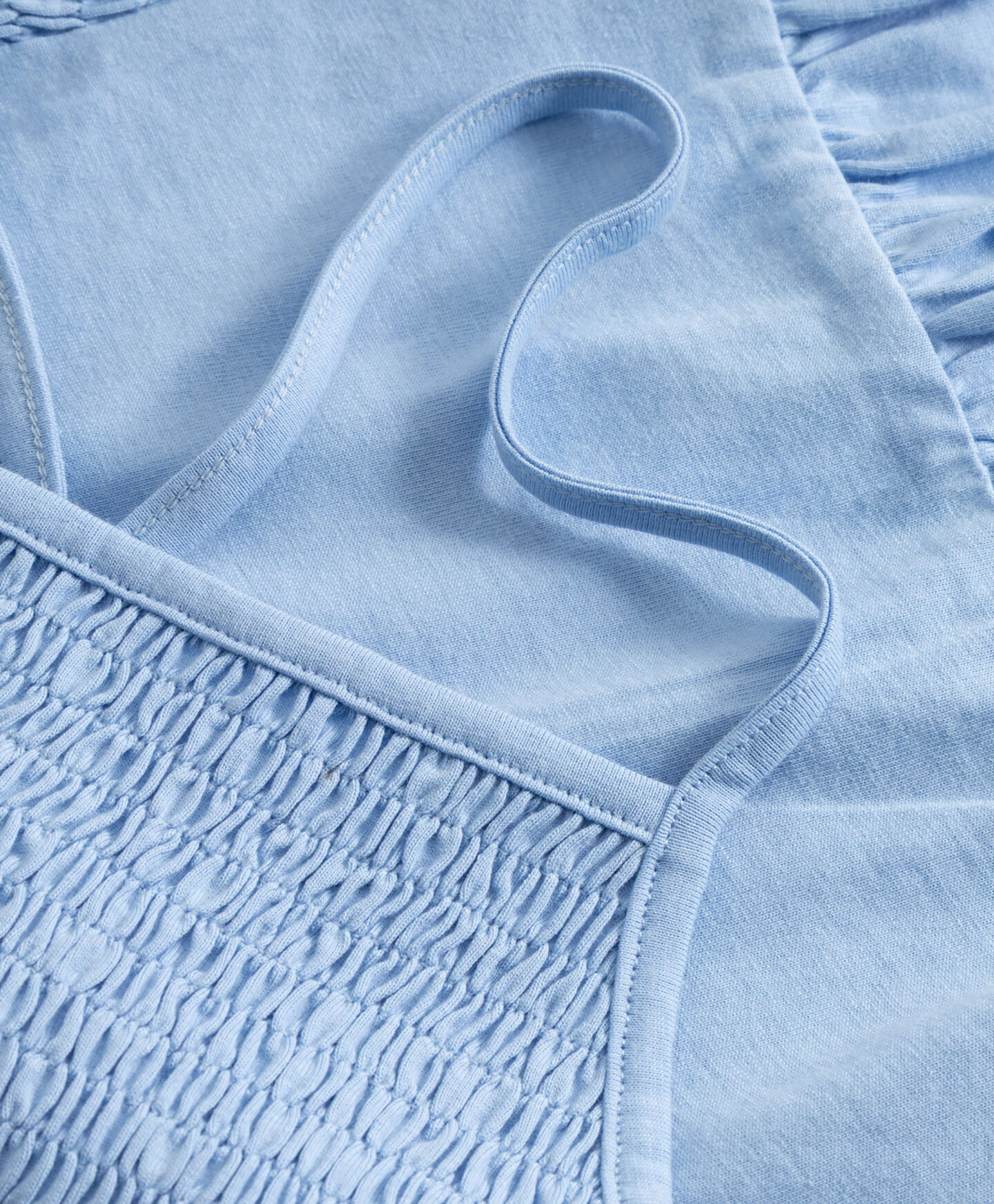 La camiseta de tirantes 100% algodón combina un diseño cuidado con un estilo muy actual. El tejido natural aporta comodidad incluso en los días más calurosos. Los fruncidos delicados, el volante decorativo y el tono azul pastel aportan un aire dulce y veraniego. Funciona perfectamente como prenda protagonista en cualquier look de verano.