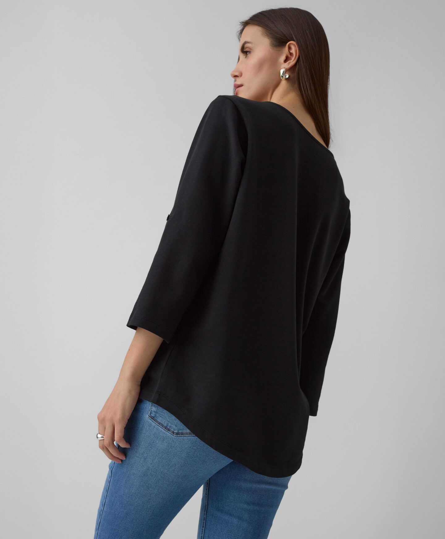 La camiseta larga con bajo redondeado y mangas remangadas es una propuesta clásica con un toque actual. Su color negro y su tejido con alto contenido en algodón la convierten en una prenda cómoda y versátil. Combina con vaqueros, pantalones elegantes o deportivos, y funciona tanto para looks informales como para combinaciones más cuidadas.