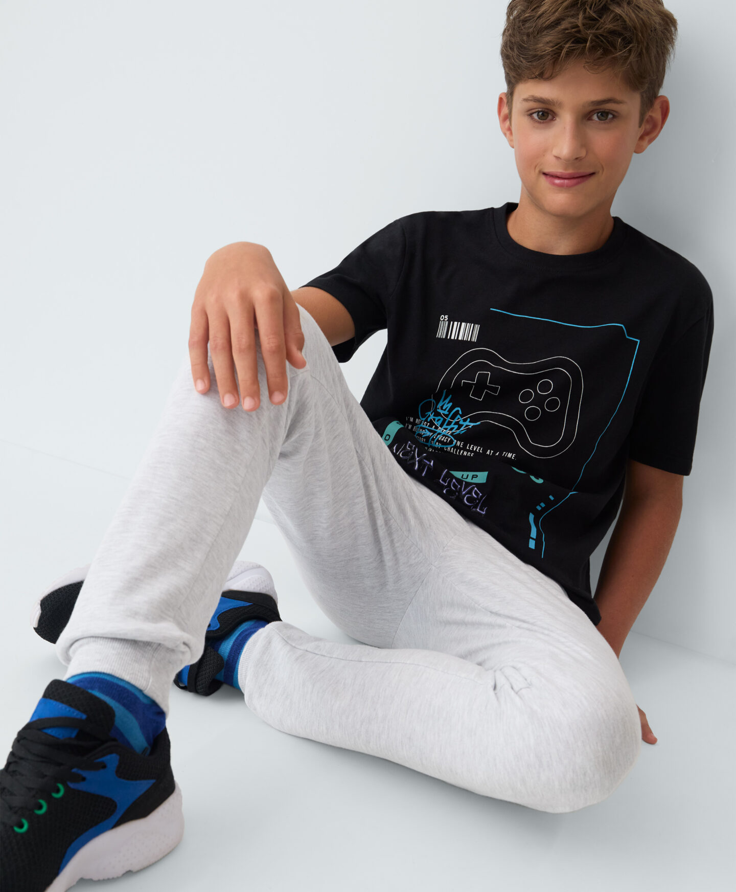 Esta camiseta negra de algodón y manga corta para llevar bajo una sudadera o jersey este otoño. Es ligera, transpirable y suave al tacto. El estampado frontal le da un toque original y lleno de personalidad. Es una opción ideal para el colegio, actividades extraescolares o tiempo de ocio.