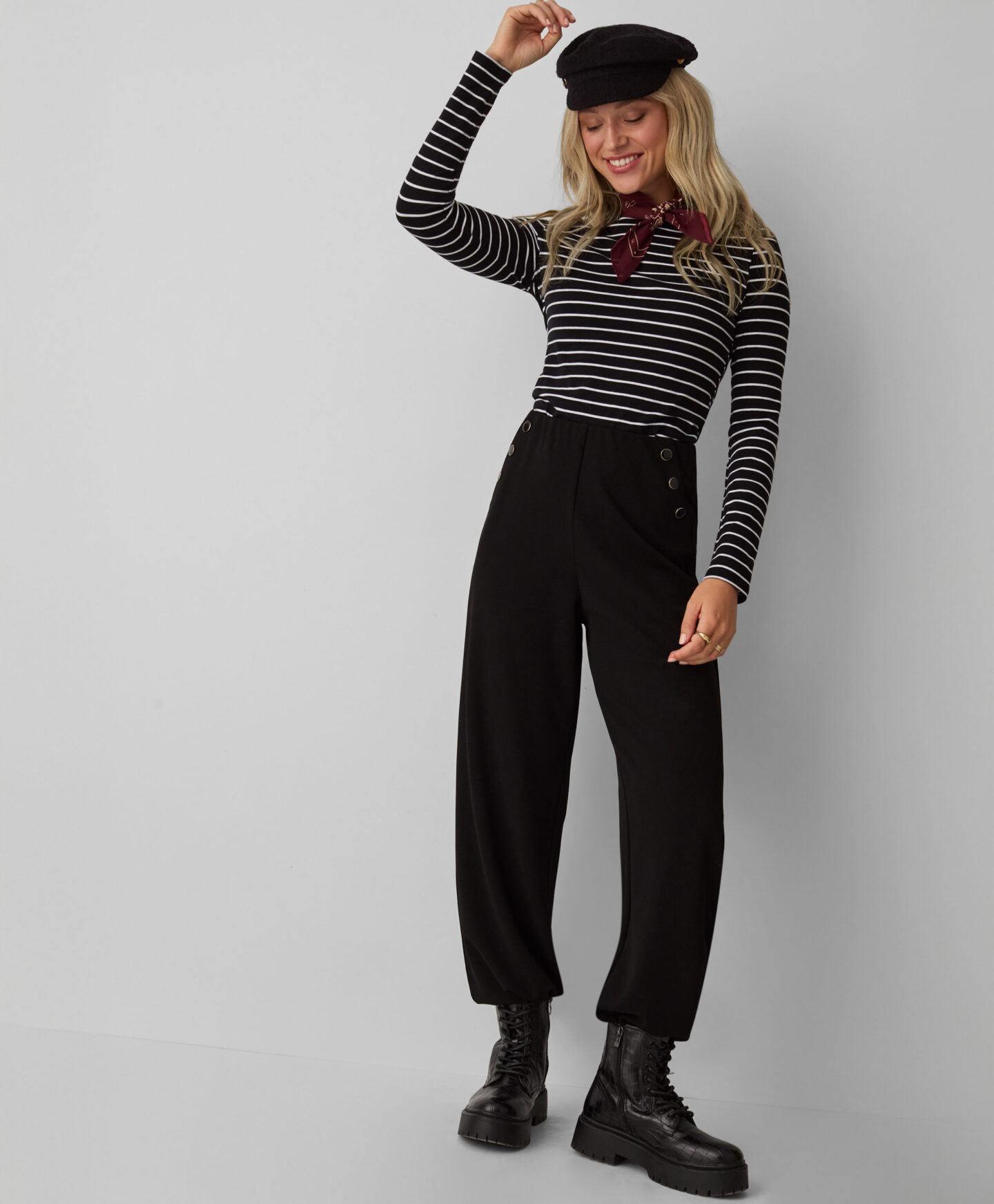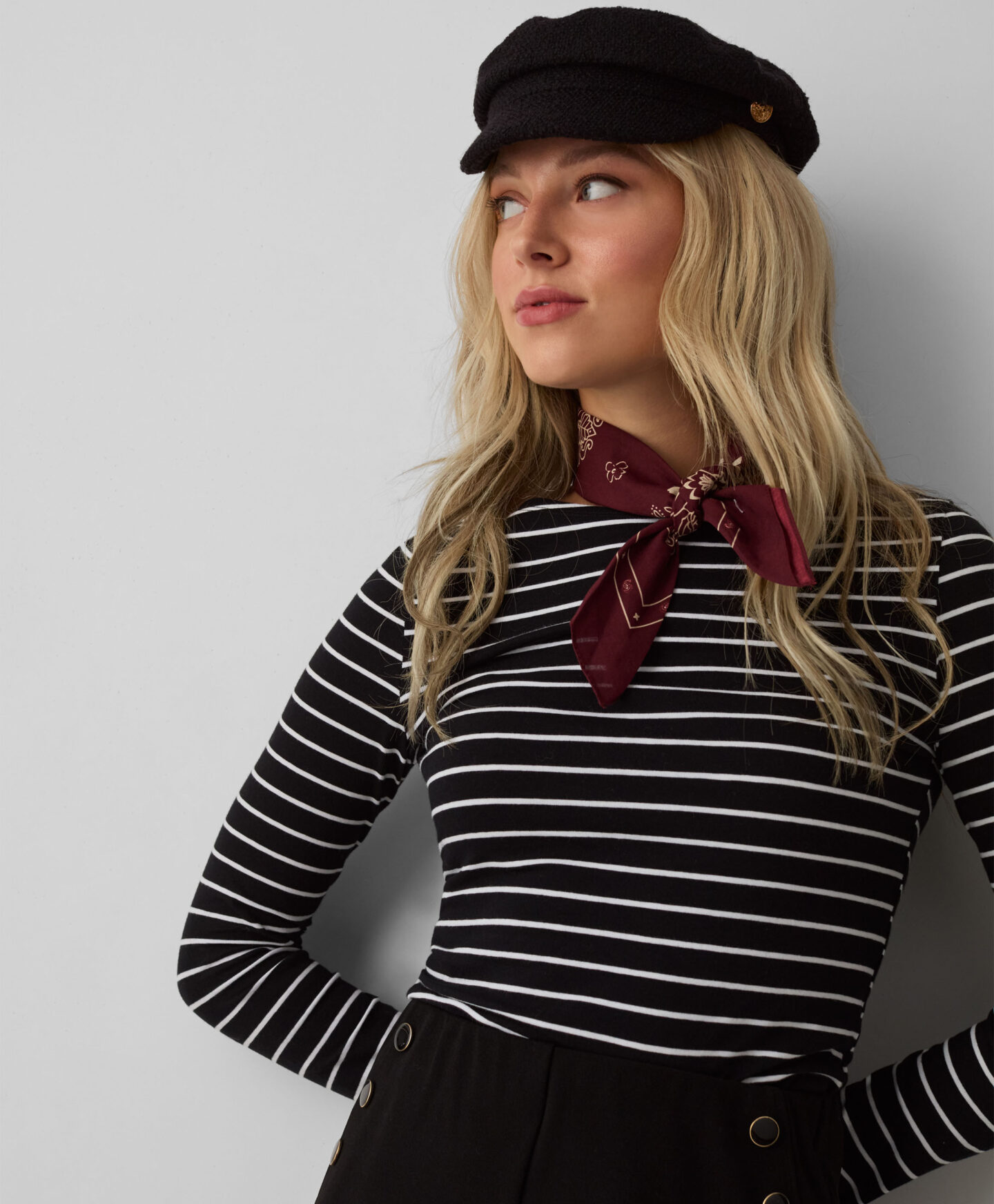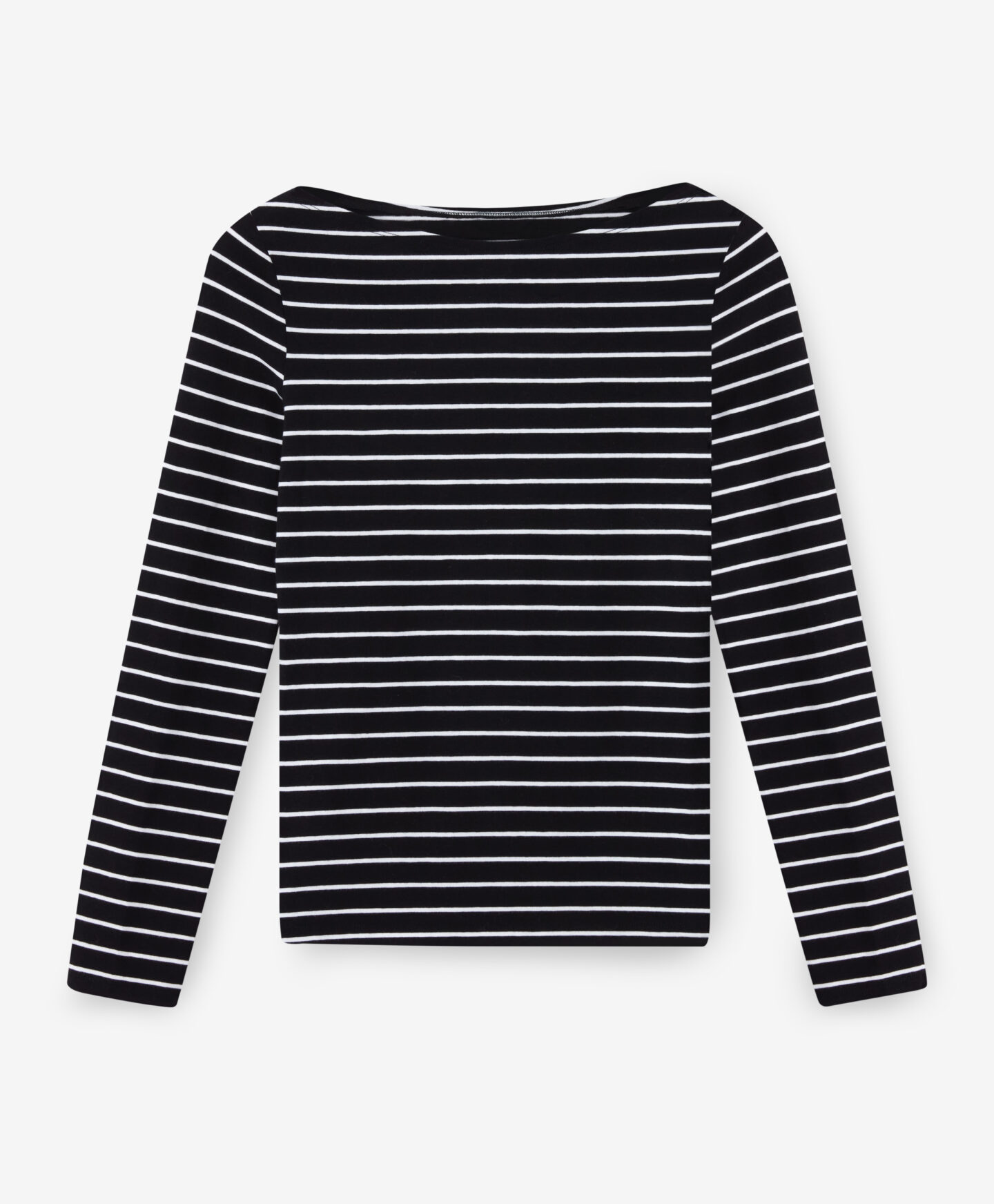 La camiseta negra a rayas de manga larga combina comodidad y estilo. Su tejido ligero, suave y transpirable la hace perfecta para cualquier momento, desde el trabajo hasta la relajación en casa. En la colección hay más versiones de este diseño a rayas.