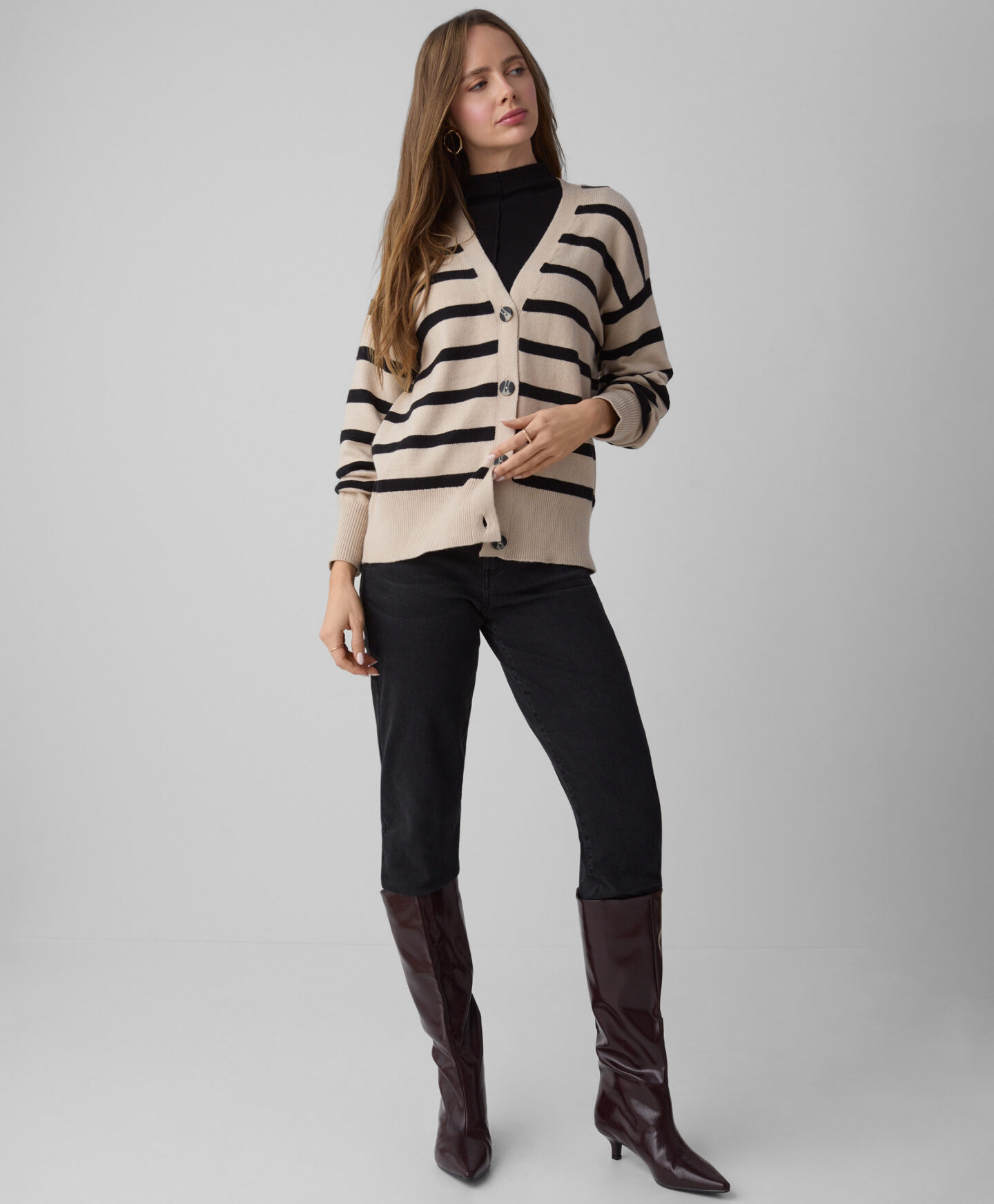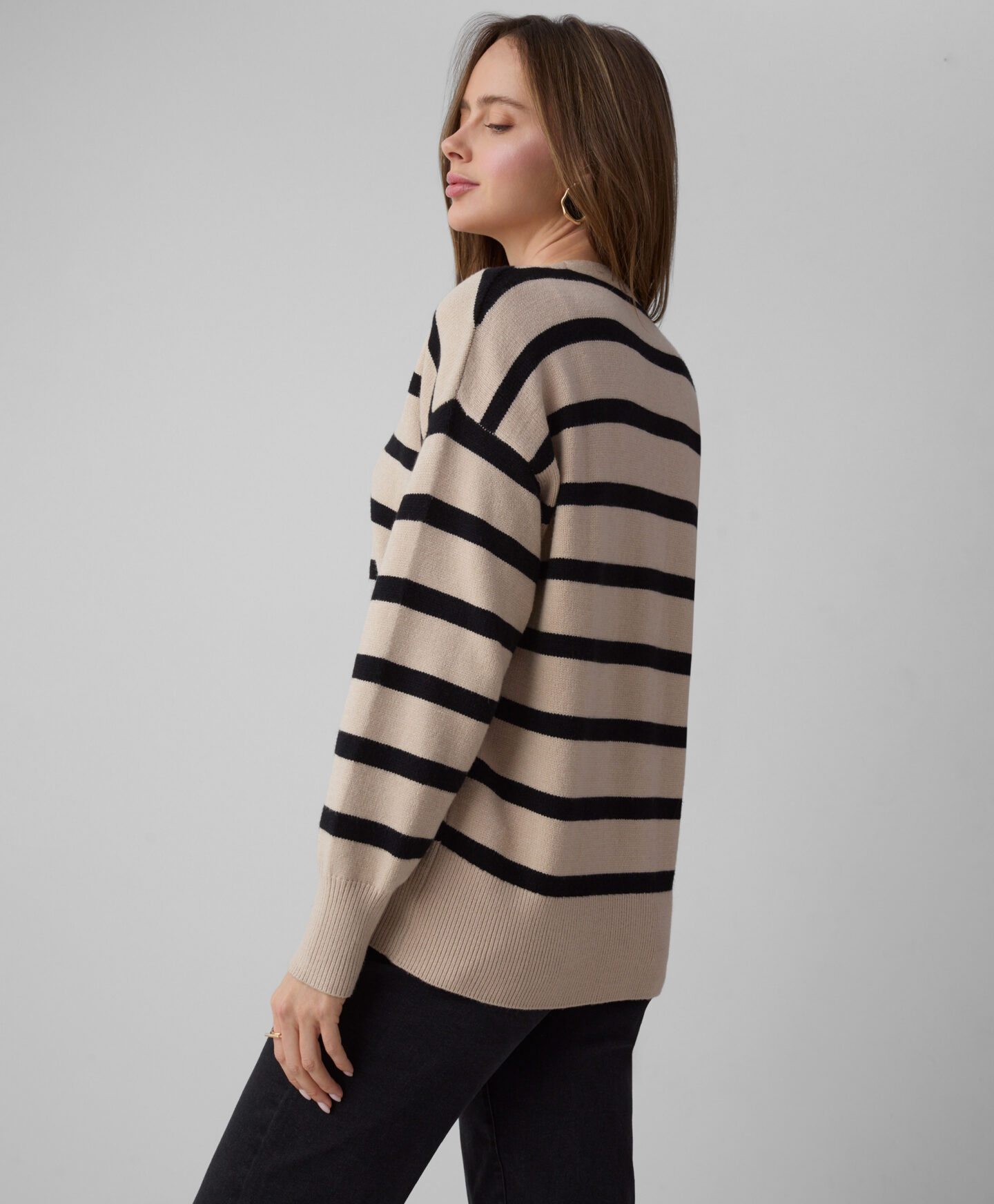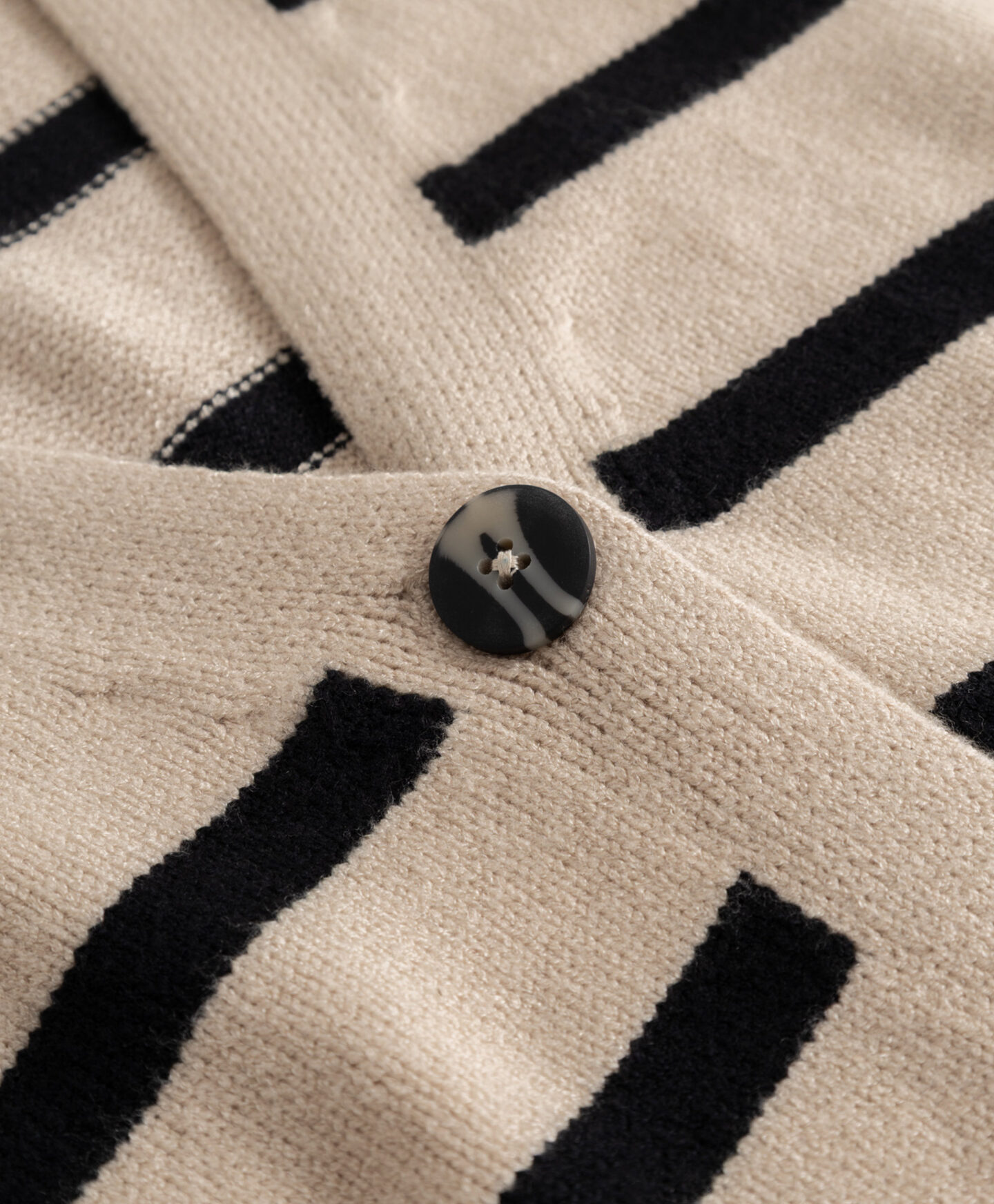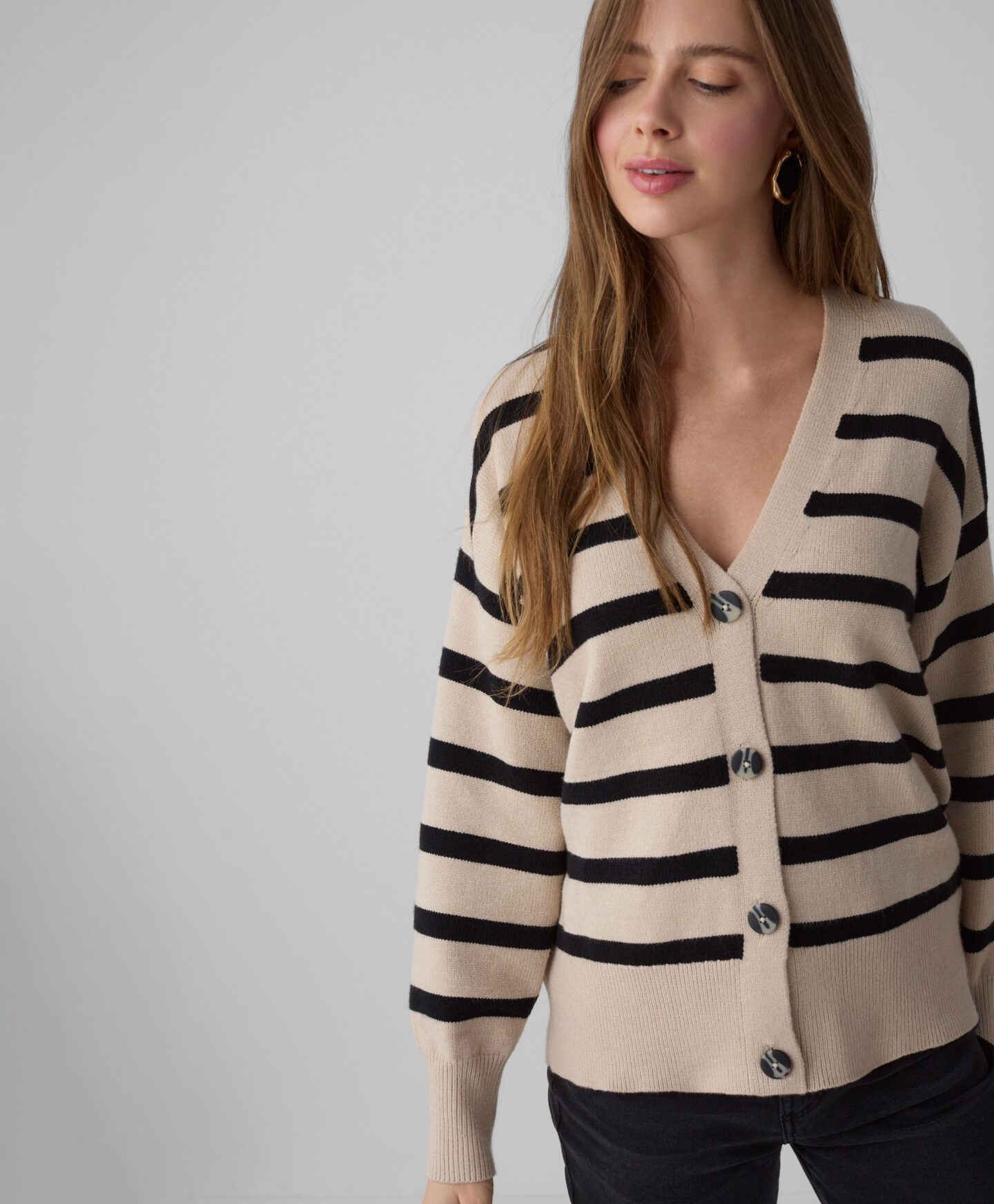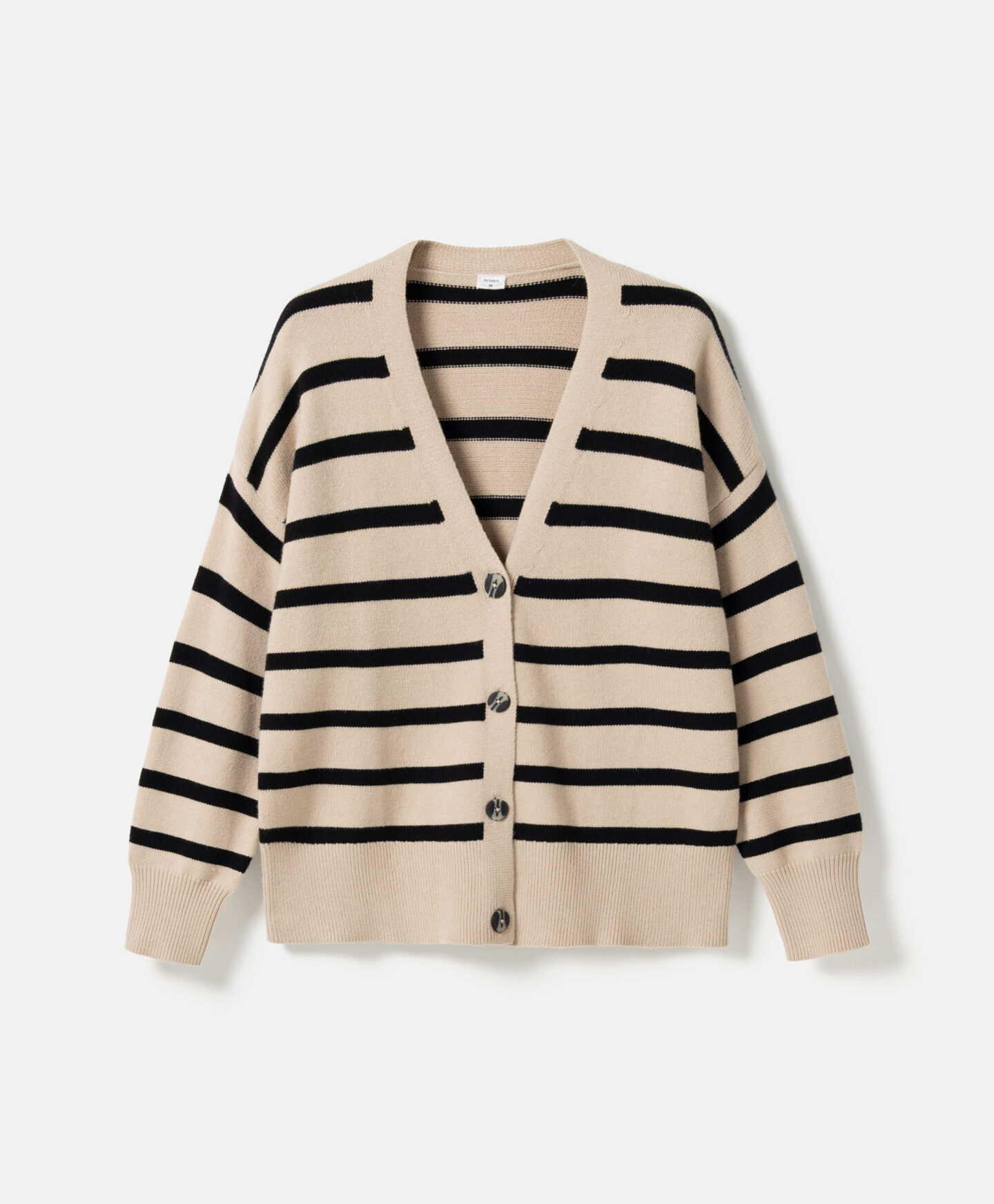 Un cárdigan a rayas en negro y beige, de corte holgado, es perfecto para las amantes del estilo clásico en versión cómoda. El estampado de rayas nunca pasa de moda y combina igual de bien con pantalones elegantes que con unos vaqueros básicos. El tejido suave con viscosa envuelve la piel con calidez en los días fríos de invierno. Disponible en dos colores.