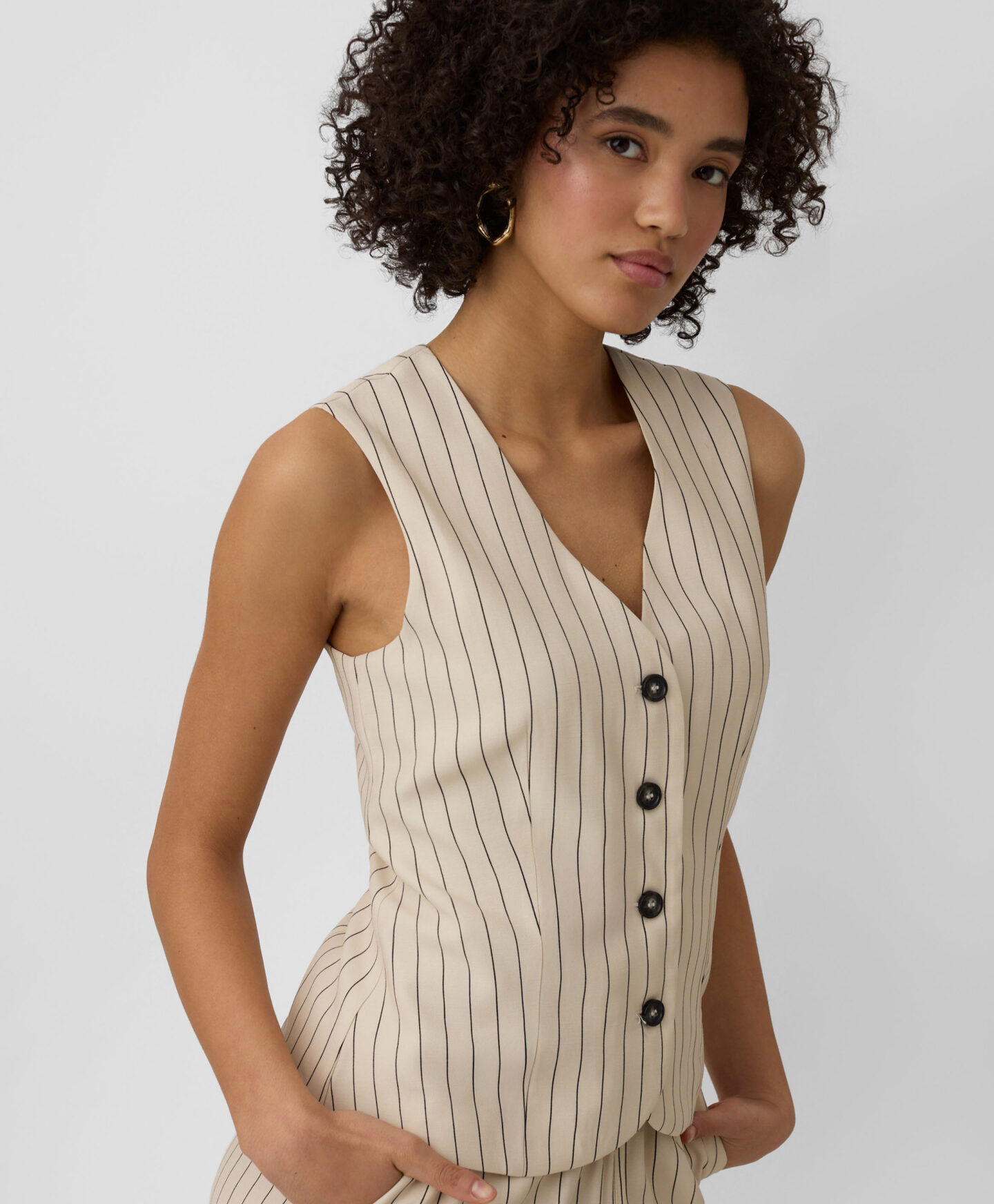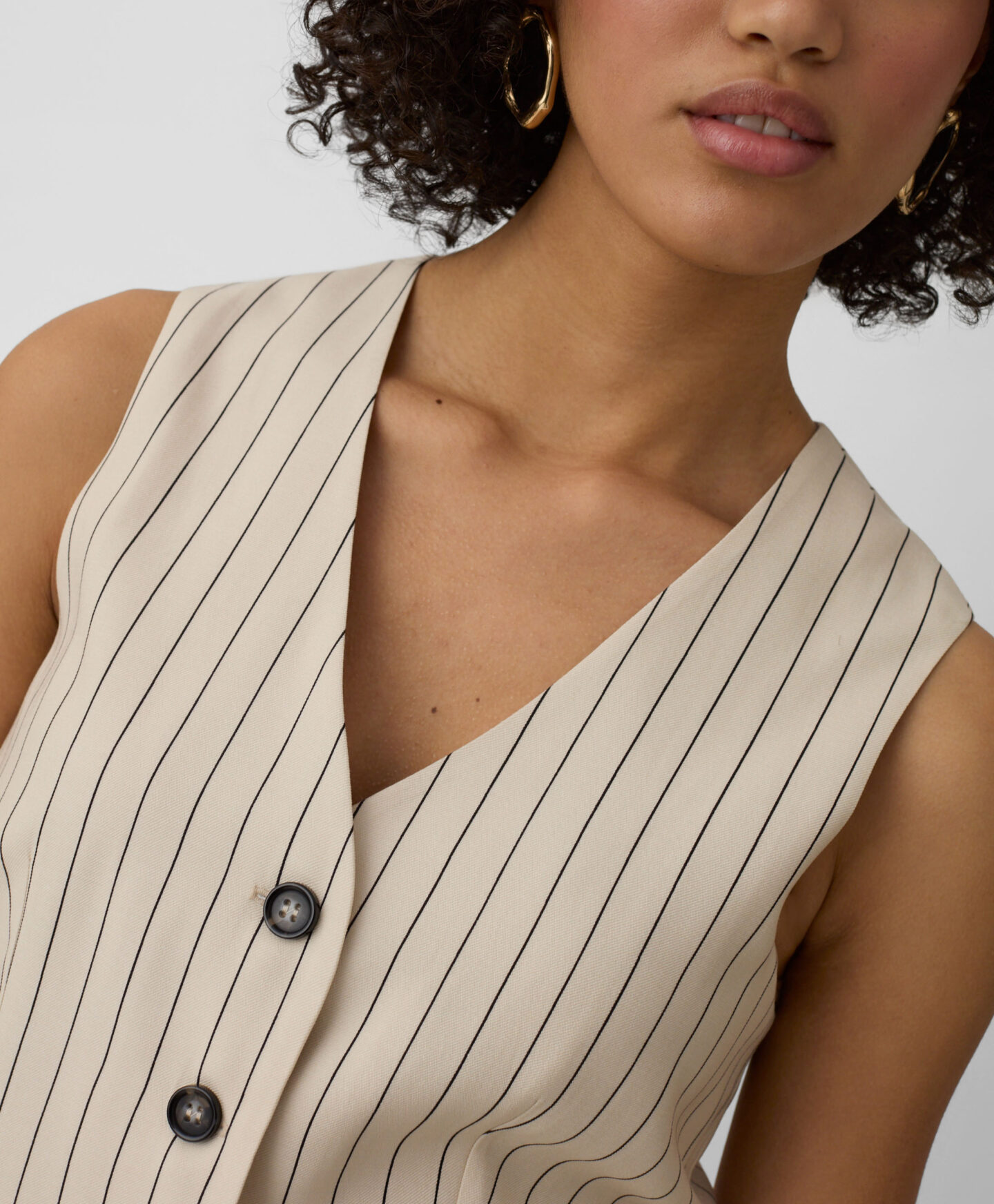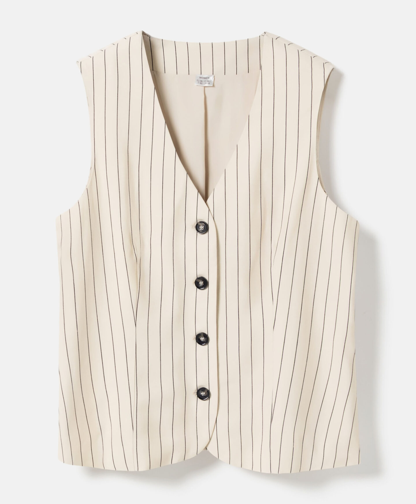 El chaleco a rayas combina a la perfección con el pantalón a juego. El alto contenido en viscosa lo hace ligero y transpirable, ideal para días cálidos. Su diseño en tonos neutros facilita múltiples combinaciones.
