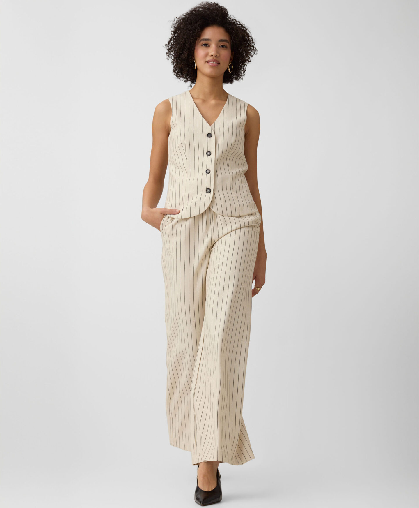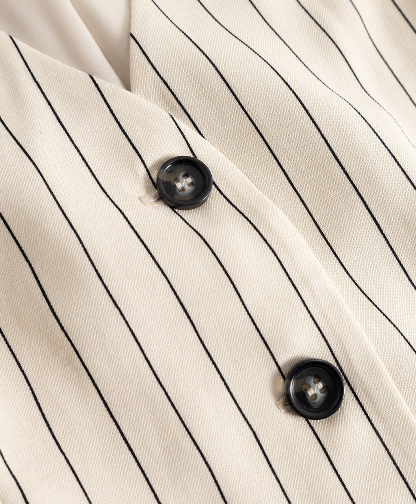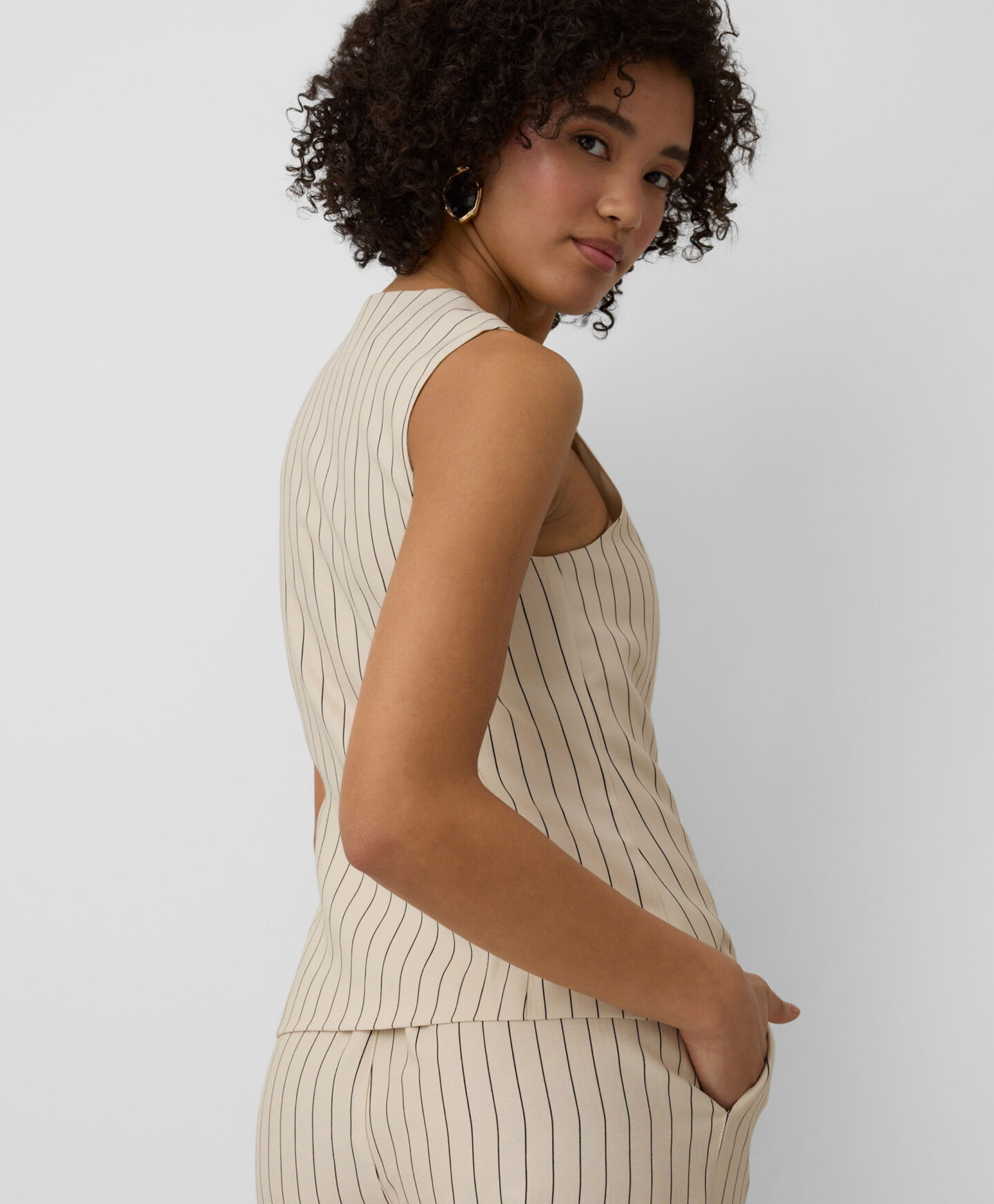 El chaleco a rayas combina a la perfección con el pantalón a juego. El alto contenido en viscosa lo hace ligero y transpirable, ideal para días cálidos. Su diseño en tonos neutros facilita múltiples combinaciones.