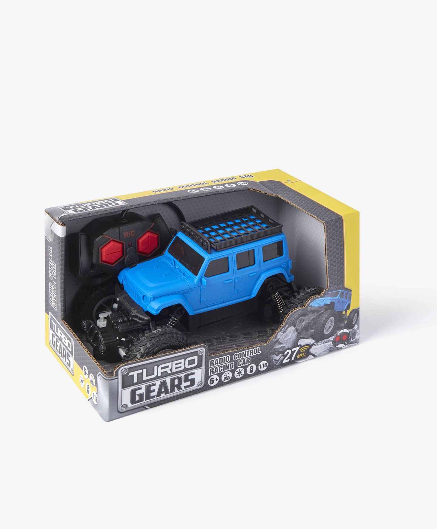 El coche todoterreno azul es un modelo teledirigido preparado para terrenos exigentes. Sus grandes ruedas y estructura resistente le permiten circular por distintas superficies. Jugar con él desarrolla la destreza y proporciona una gran sensación de control.
