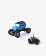El coche todoterreno azul es un modelo teledirigido preparado para terrenos exigentes. Sus grandes ruedas y estructura resistente le permiten circular por distintas superficies. Jugar con él desarrolla la destreza y proporciona una gran sensación de control.