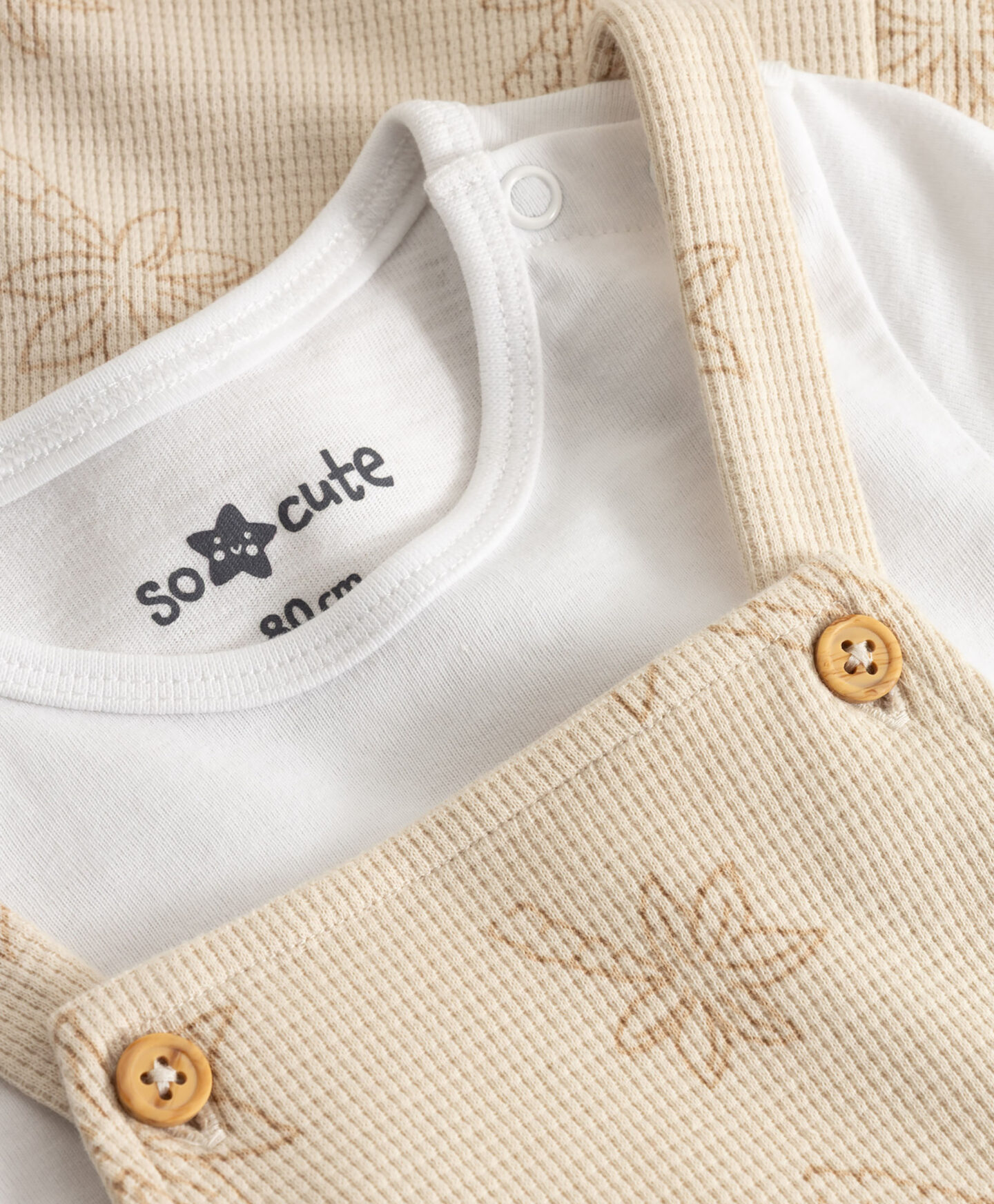 El conjunto para bebé combina comodidad y practicidad en el día a día. El tejido 100% algodón resulta suave con la piel del bebé y permite que respire con facilidad. El conjunto incluye un body de manga corta y un peto. Los automáticos del body facilitan el cambio del pañal sin necesidad de desvestir completamente al bebé. El peto tiene un corte holgado que deja espacio para el pañal y permite moverse con total comodidad.