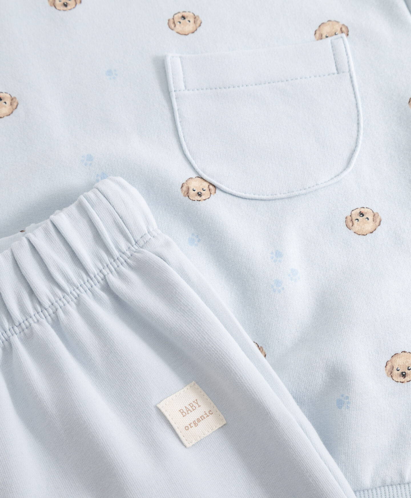 El conjunto incluye pantalón y sudadera con estampado de perro. Su tono azul suave combina fácilmente con el armario. Tanto la sudadera como el pantalón llevan puños elásticos para más abrigo y confort. El tejido con alto contenido en algodón es ideal desde los primeros looks.