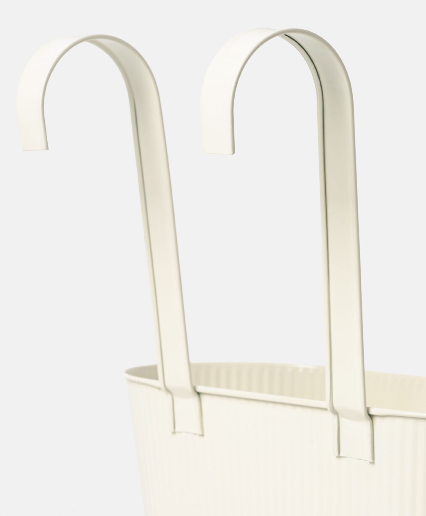 Este cubremacetas colgante alargado de color blanco con paredes acanaladas, llama la atención por su diseño primaveral. Sus prácticos ganchos de suspensión permiten colgarla de la barandilla de un balcón o de una pared de madera, aprovechando al máximo el espacio disponible. Hay varios diseños disponibles en la oferta.