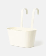 Este cubremacetas colgante alargado de color blanco con paredes acanaladas, llama la atención por su diseño primaveral. Sus prácticos ganchos de suspensión permiten colgarla de la barandilla de un balcón o de una pared de madera, aprovechando al máximo el espacio disponible. Hay varios diseños disponibles en la oferta.