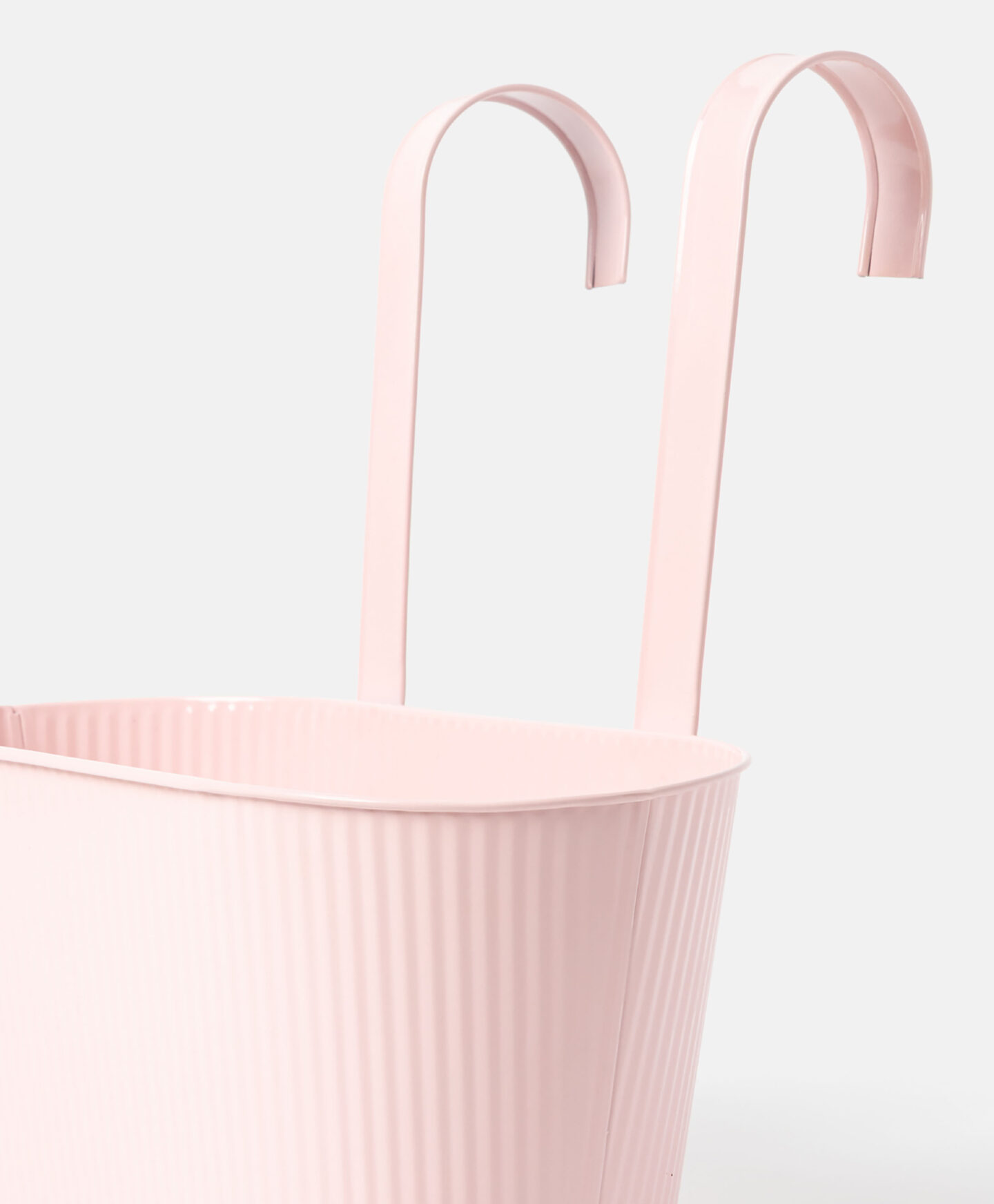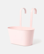 Este cubremaceta colgante alargado de color rosa con paredes acanaladas, llama la atención por su diseño primaveral. Sus prácticos ganchos de suspensión permiten colgarla de la barandilla de un balcón o de una pared de madera, aprovechando al máximo el espacio disponible. Hay varios diseños disponibles en la oferta.