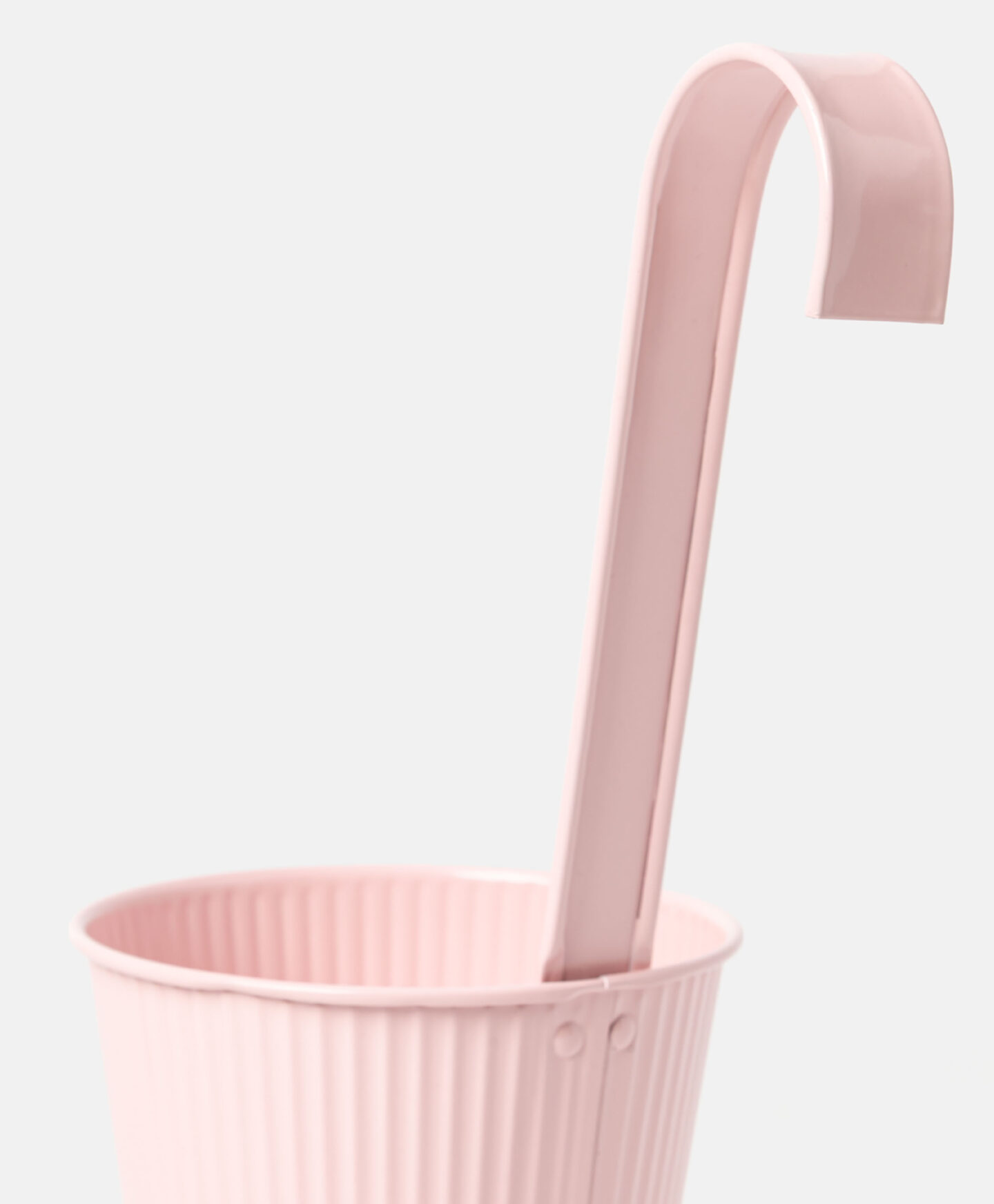 Esta maceta colgante rosa con paredes acanaladas llama la atención por su diseño primaveral. Su práctico gancho de suspensión permite colocarla en la barandilla del balcón, bajo el techo o en una pared de madera, aprovechando al máximo el espacio disponible. Su estructura metálica es duradera y resistente a la corrosión, al sol y a las inclemencias del tiempo, lo que garantiza un uso prolongado. Hay varios diseños disponibles en la oferta.