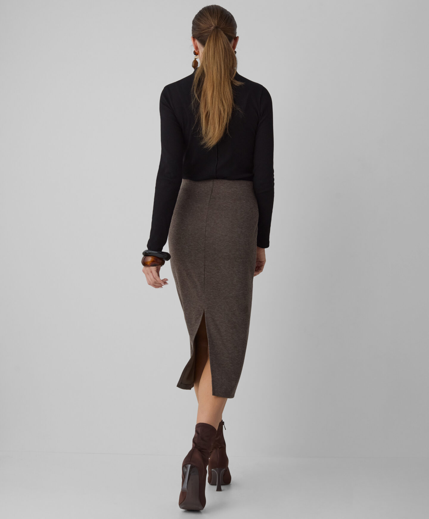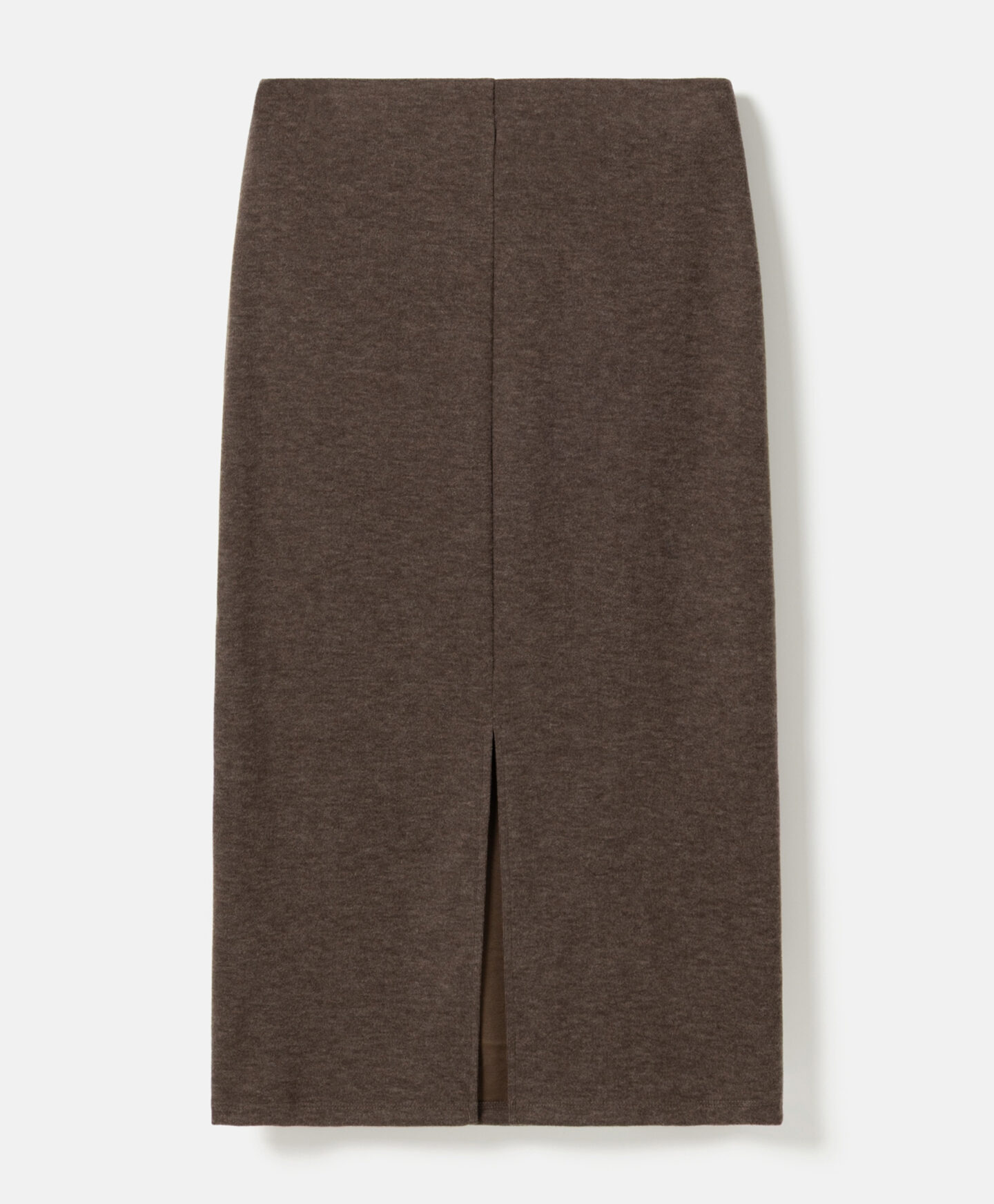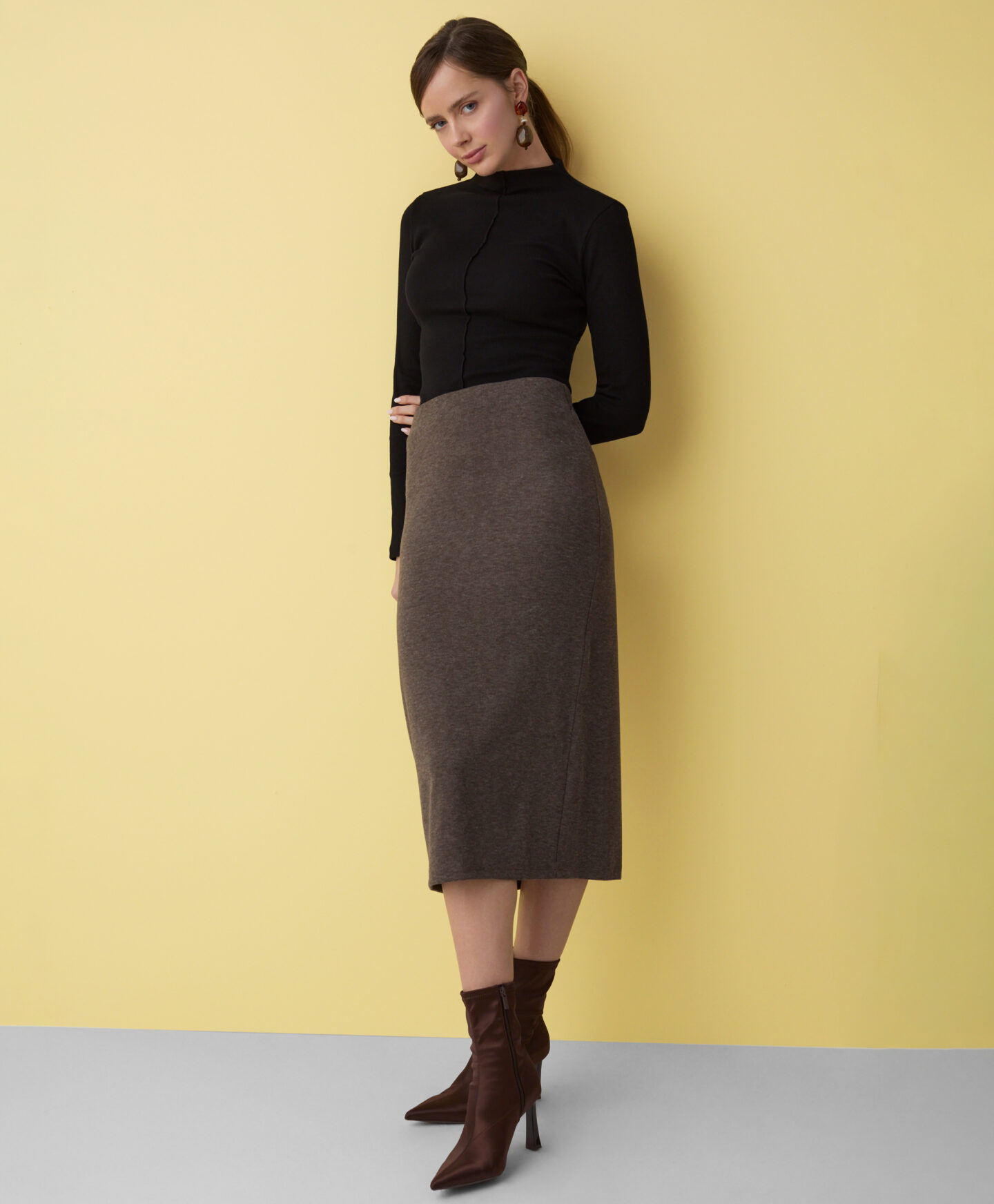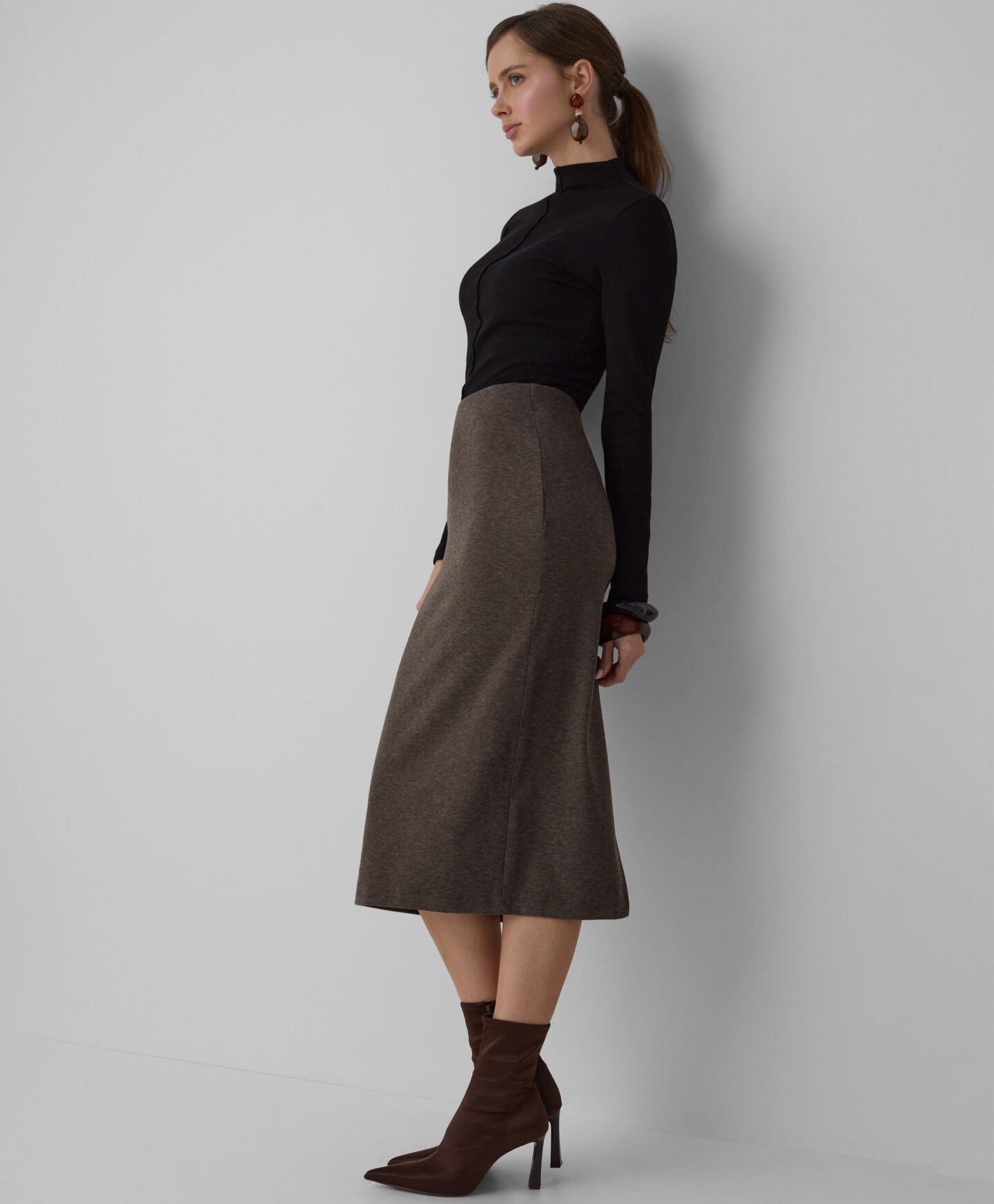 La falda midi marrón combina a la perfección con una camiseta de la misma colección. Es elegante y agradable al tacto. Con una blusa casual o una camisa elegante, crea conjuntos muy favorecedores. Su tono marrón profundo encaja perfectamente con el estilo otoño-invierno.