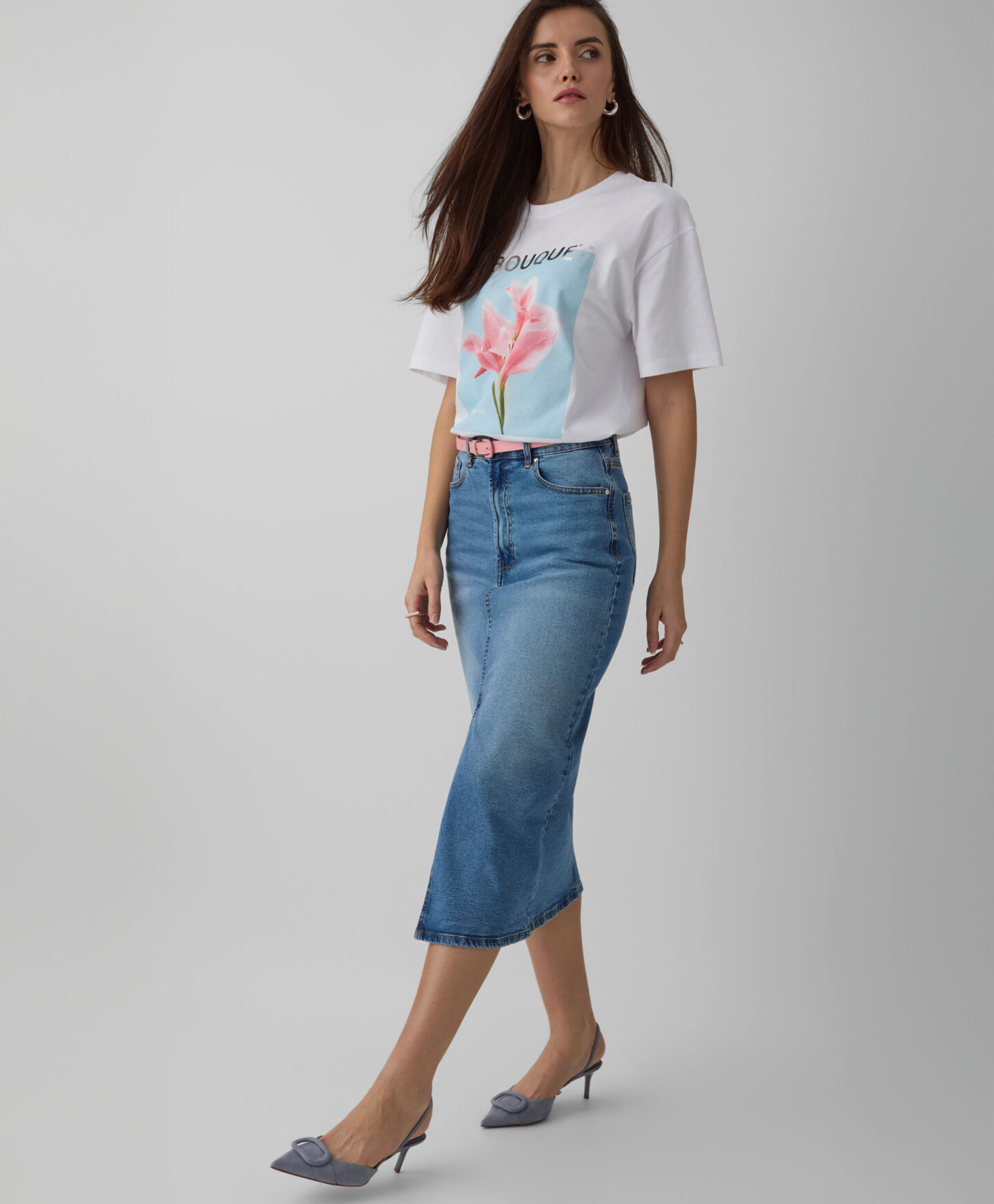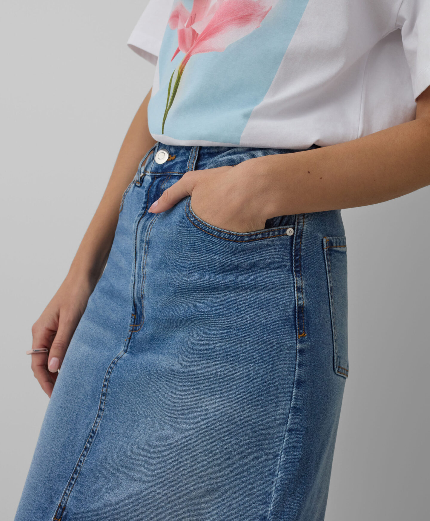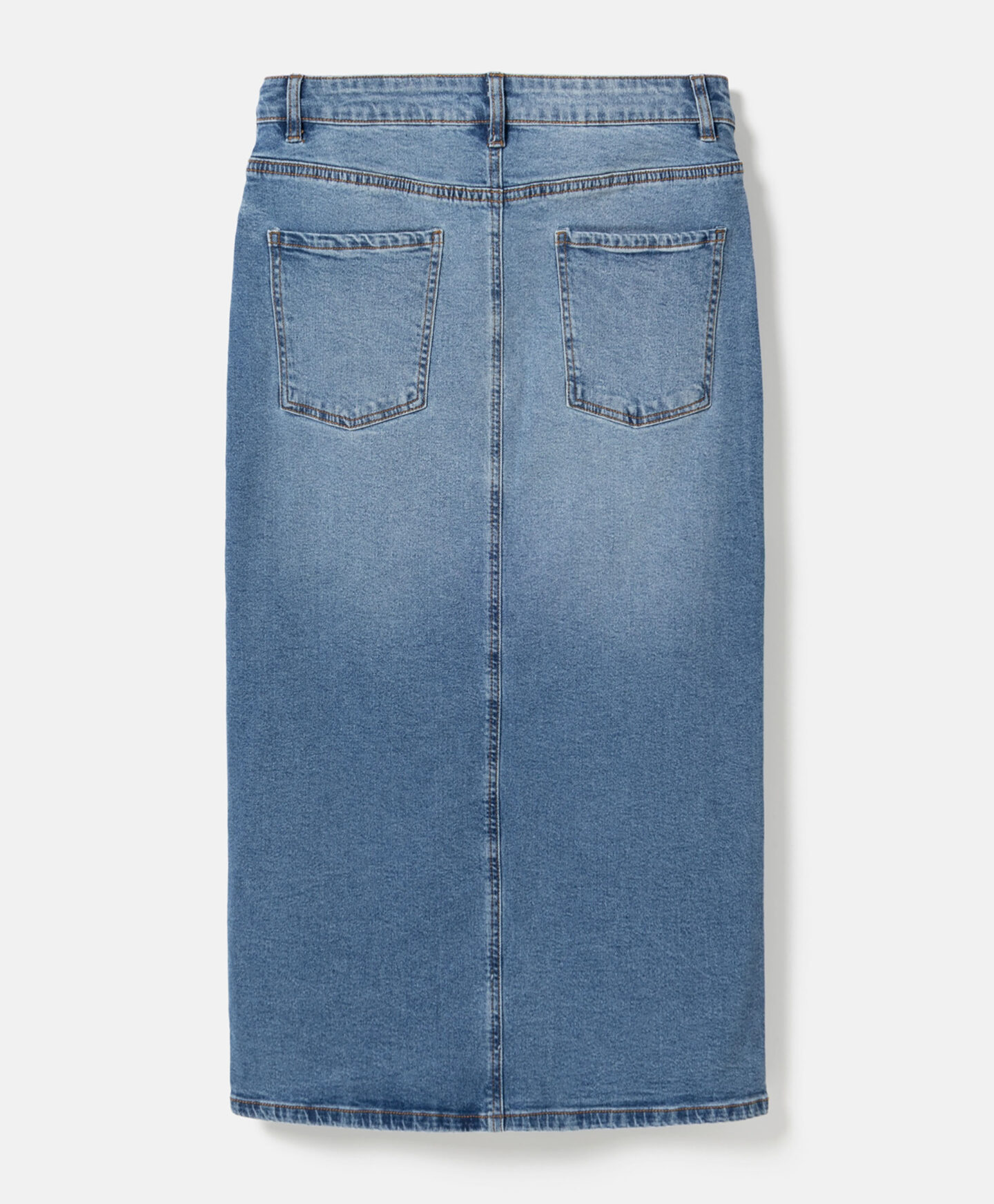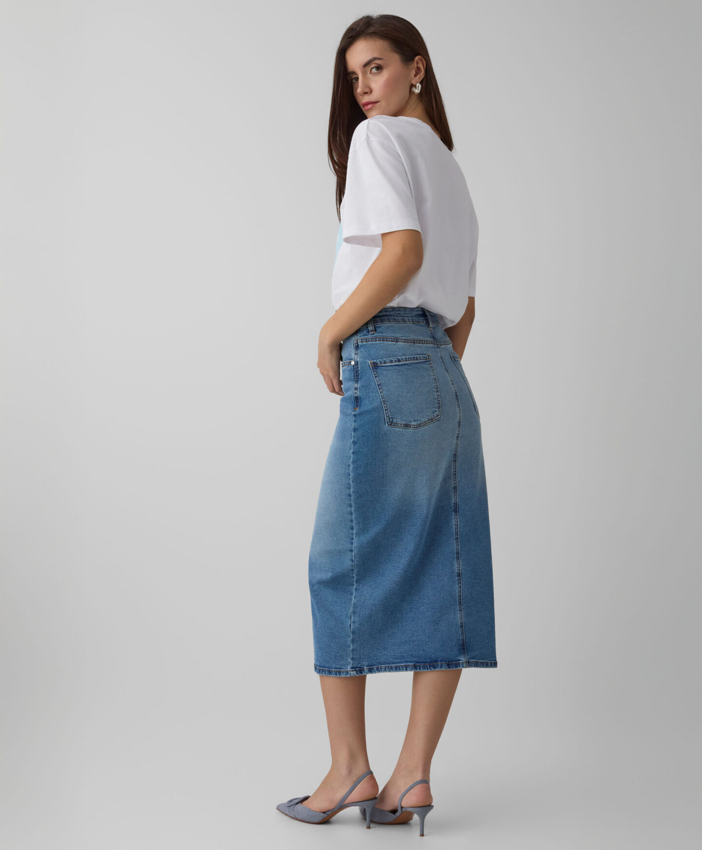 La falda vaquera con abertura frontal realza la figura y aporta un estilo atemporal. El tejido vaquero combina tanto con camisetas básicas como con camisas más elegantes. Su largo midi la hace adecuada para cualquier ocasión.