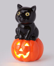 El gato sentado sobre una calabaza LED es una decoración encantadora, perfecta para Halloween. La calabaza emite una luz suave que crea un ambiente cálido y mágico. Ideal para decorar interiores, ventanas o chimeneas.