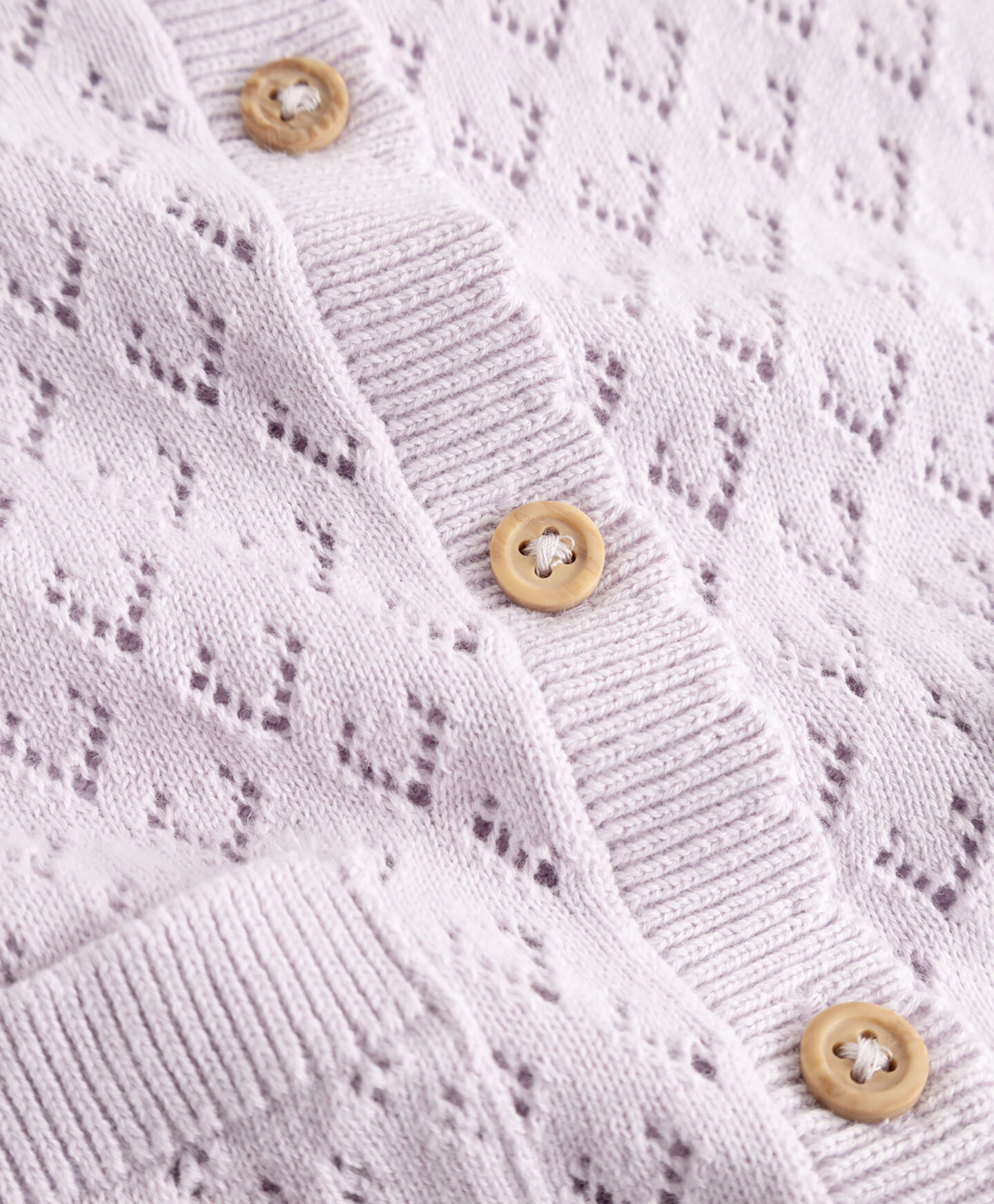 El jersey 100% algodón con estructura calada es ligero y elegante. El material natural permite que la piel respire y es seguro desde las primeras semanas. El bordado floral en el bolsillo añade un detalle decorativo. Se puede llevar sobre camisetas, camisas o vestidos. El color primaveral aporta frescura al armario.