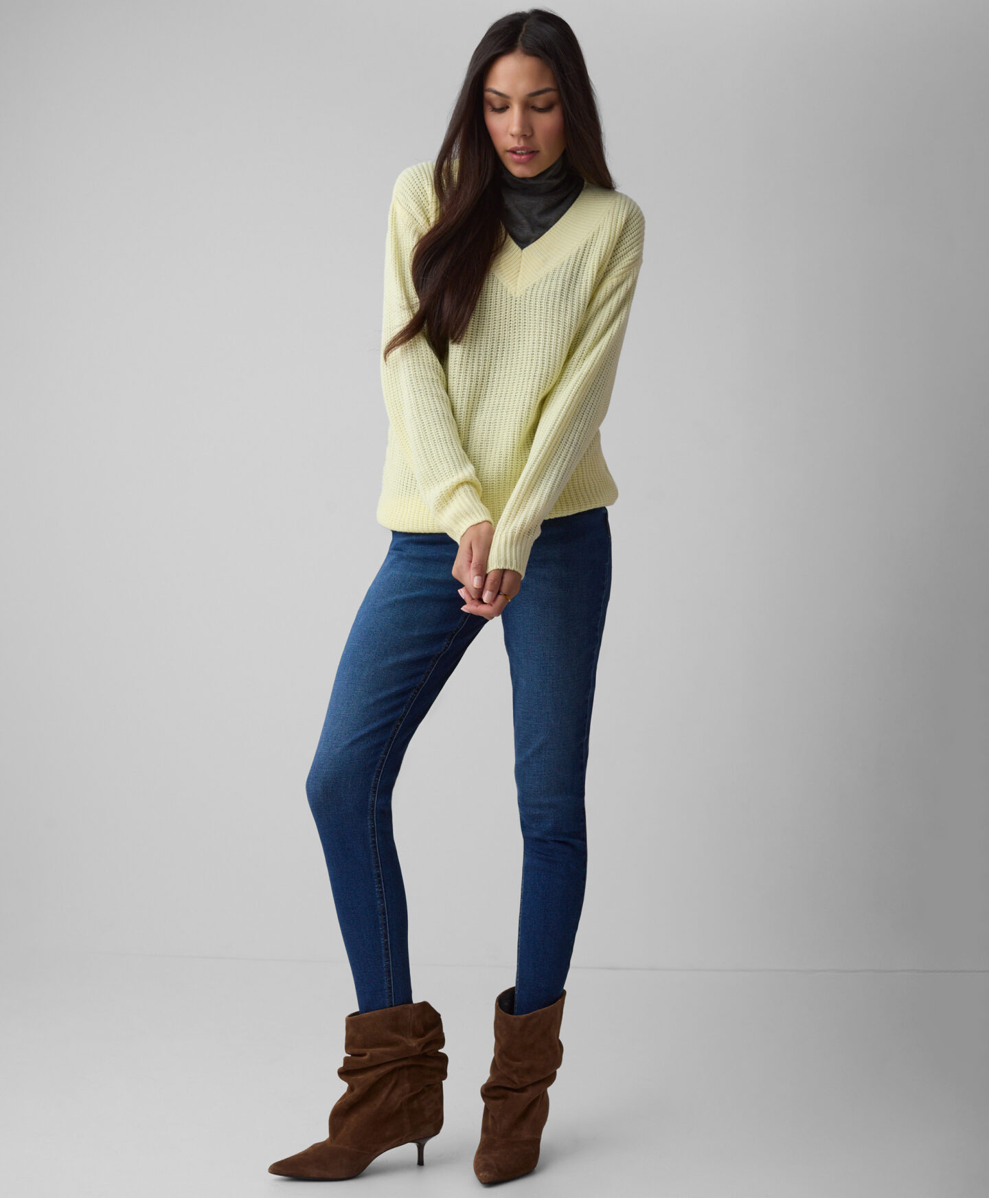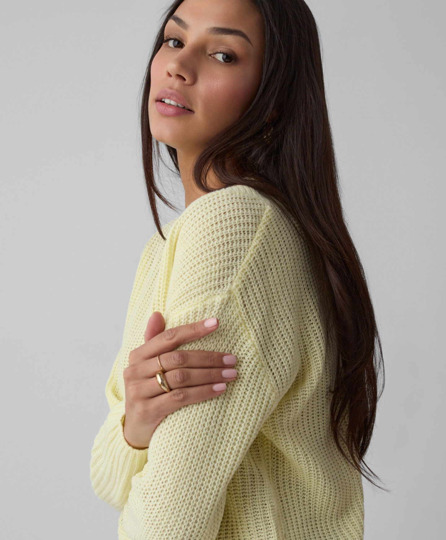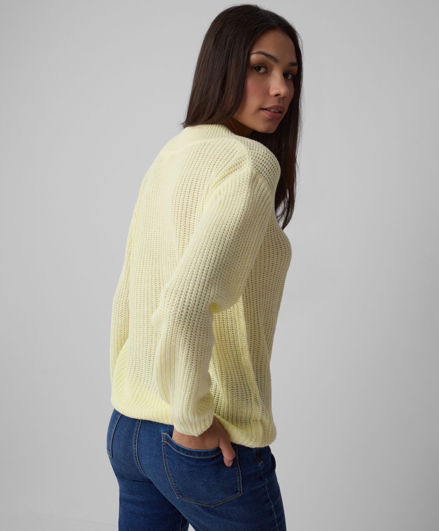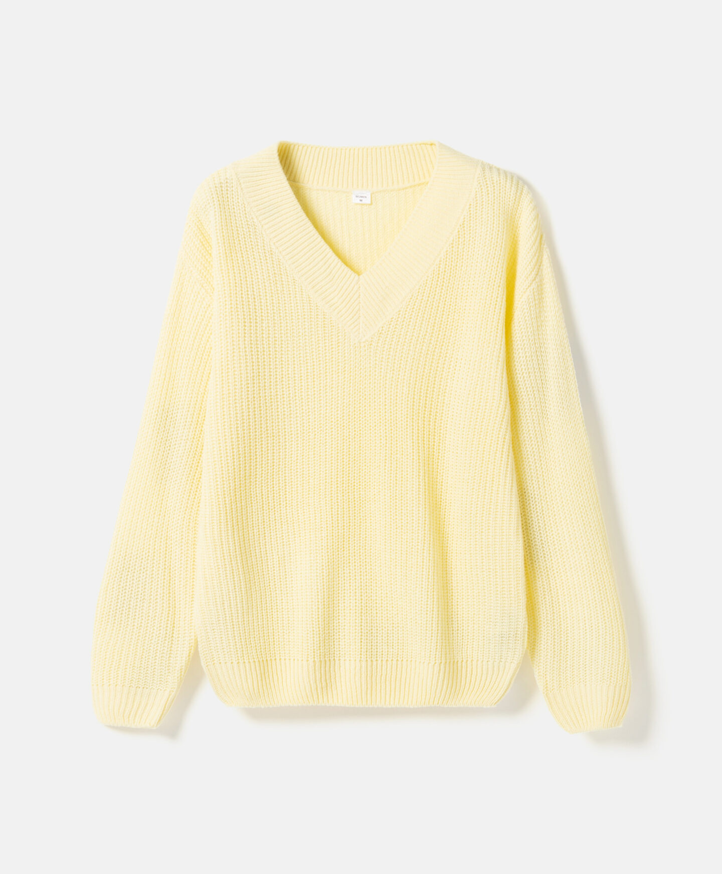 Un jersey amarillo con escote en V es ideal para el día a día. Una excelente opción para llevar sobre una camiseta o una camisa elegante. El escote realza la zona del cuello y estiliza la figura, mientras el punto trenzado aporta carácter al look. Es cálido, suave y muy delicado. Disponible en dos diseños.