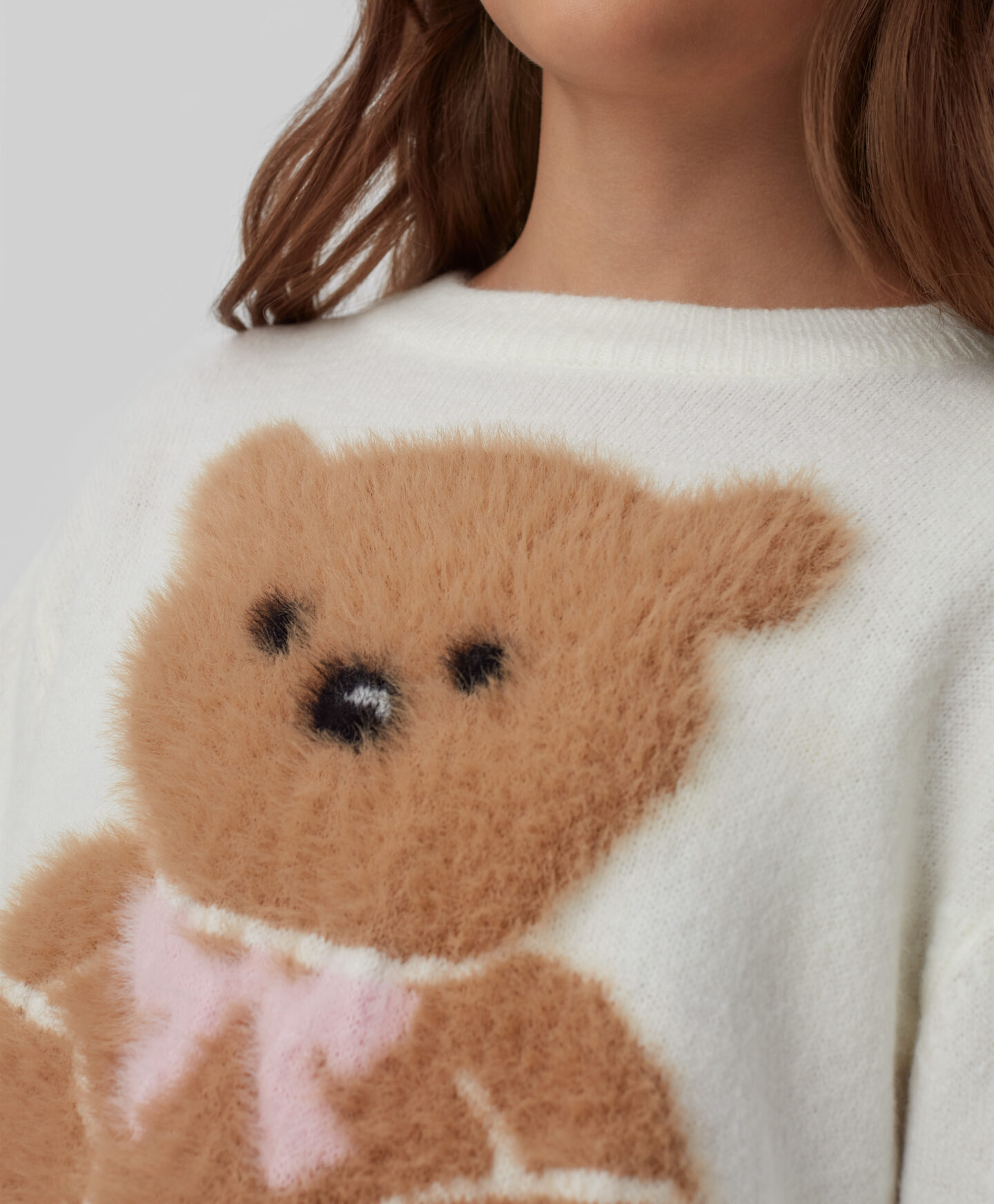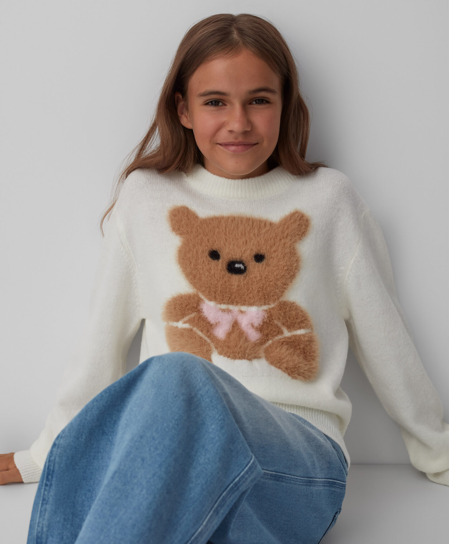 Este jersey con estampado de oso es el favorito de la temporada otoño/invierno. Su diseño adorable con un osito en la parte frontal aporta un toque encantador a cualquier look. Una prenda que combina a la perfección con vaqueros, leggings o falda, ¡y que los peques no se querrán quitar!