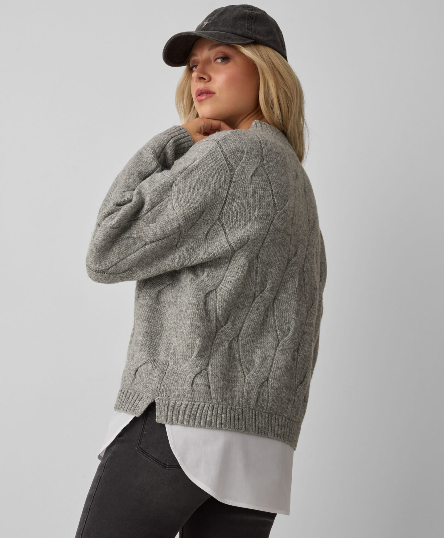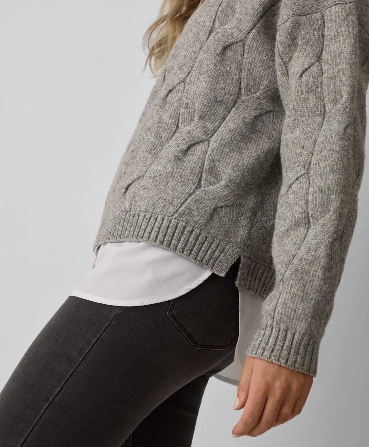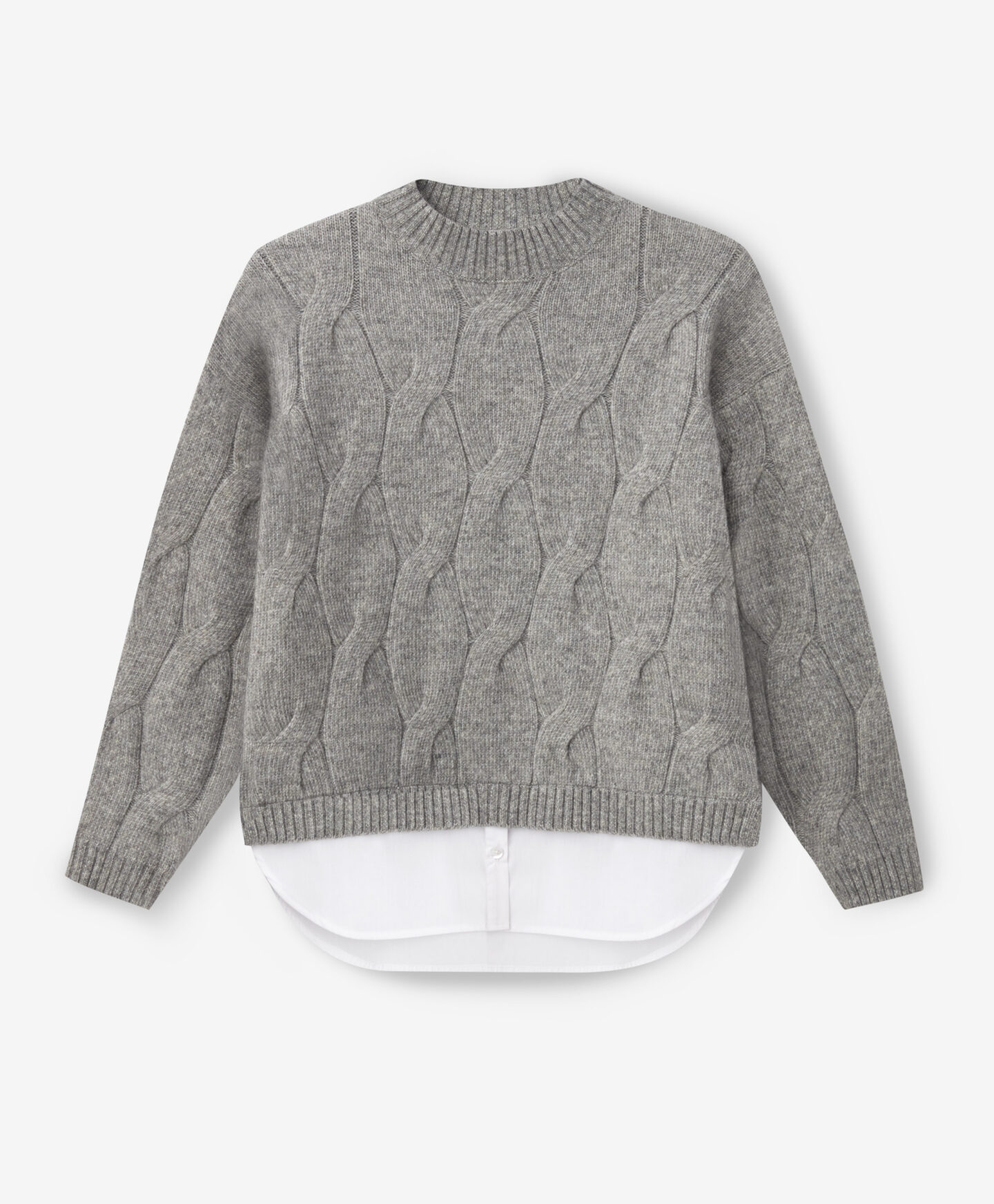 El jersey gris con camisa incorporada es una opción moderna y elegante. El punto trenzado evoca el estilo otoñal y, junto con la camisa blanca, crea un look cuidado y actual. Ideal para ir al trabajo, salir o disfrutar del día. Disponible en dos colores.