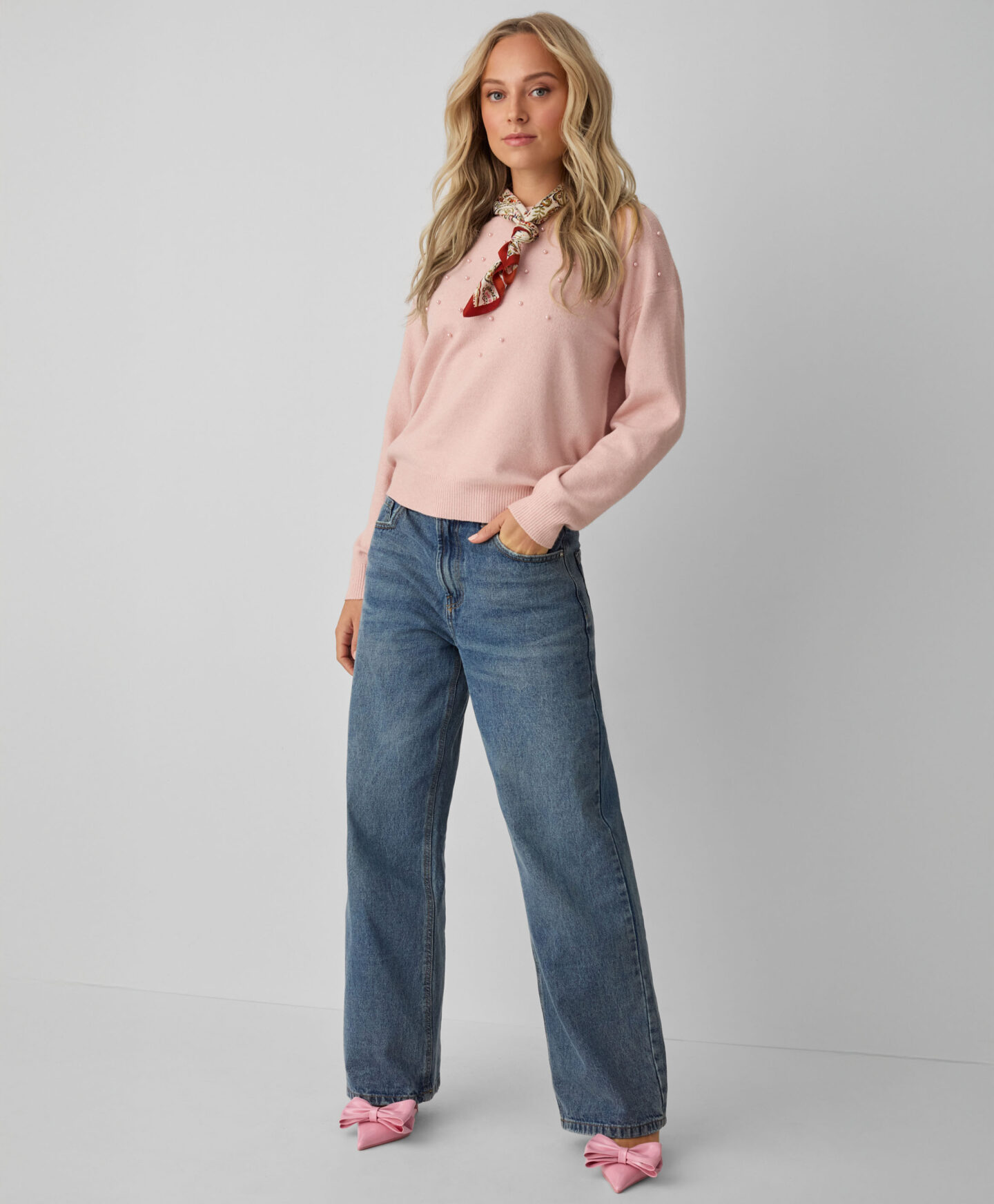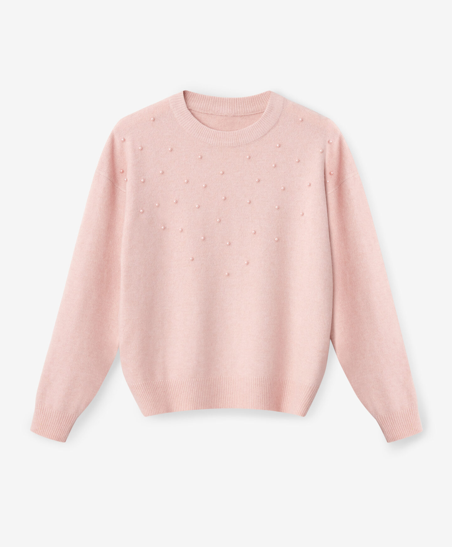 El jersey rosa con perlas es una opción elegante para el día a día. Su tejido cálido y suave al tacto, junto con las pequeñas perlas en la parte frontal, añaden un detalle delicado. Combina muy bien con falda, vestido o pantalón, tanto en conjuntos de oficina como en looks más formales. Disponible en dos colores.