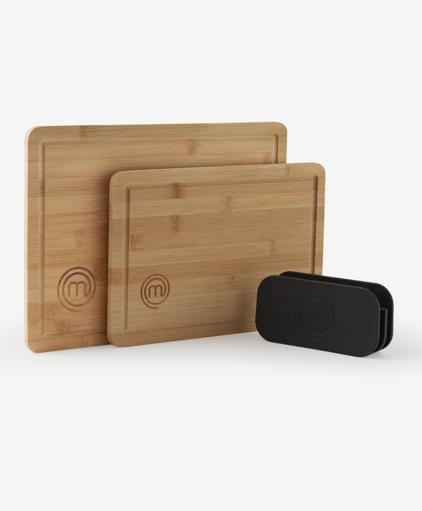 El juego de tablas de cortar MasterChef con soporte es ideal para quienes buscan funcionalidad y estilo en la cocina. Están fabricadas en bambú, por lo que son duraderas e higiénicas. El soporte permite guardarlas de forma cómoda, ahorrando espacio en la encimera. Con diferentes tamaños, el set es perfecto para cortar verduras, carne y pan.