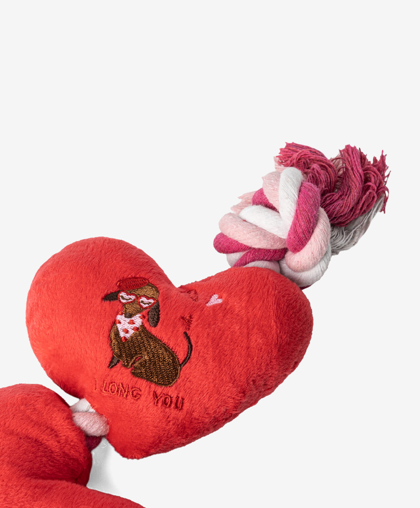 El juguete de cuerda para perro con dos corazones es ideal para mascotas activas. Uno de los corazones incorpora sonido, lo que estimula el juego y la interacción. La cuerda resistente resulta perfecta para juegos de tira y afloja, mientras que los corazones suaves aportan confort durante la mordida.