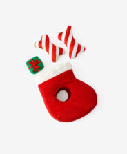 El kit de regalo para mascota incluye varios accesorios que hacen más divertidos los momentos del día a día. Huesos de peluche con rayas tipo caramelo y un pequeño regalo son ideales para morder, mientras que el calcetín festivo sirve para guardar los juguetes.