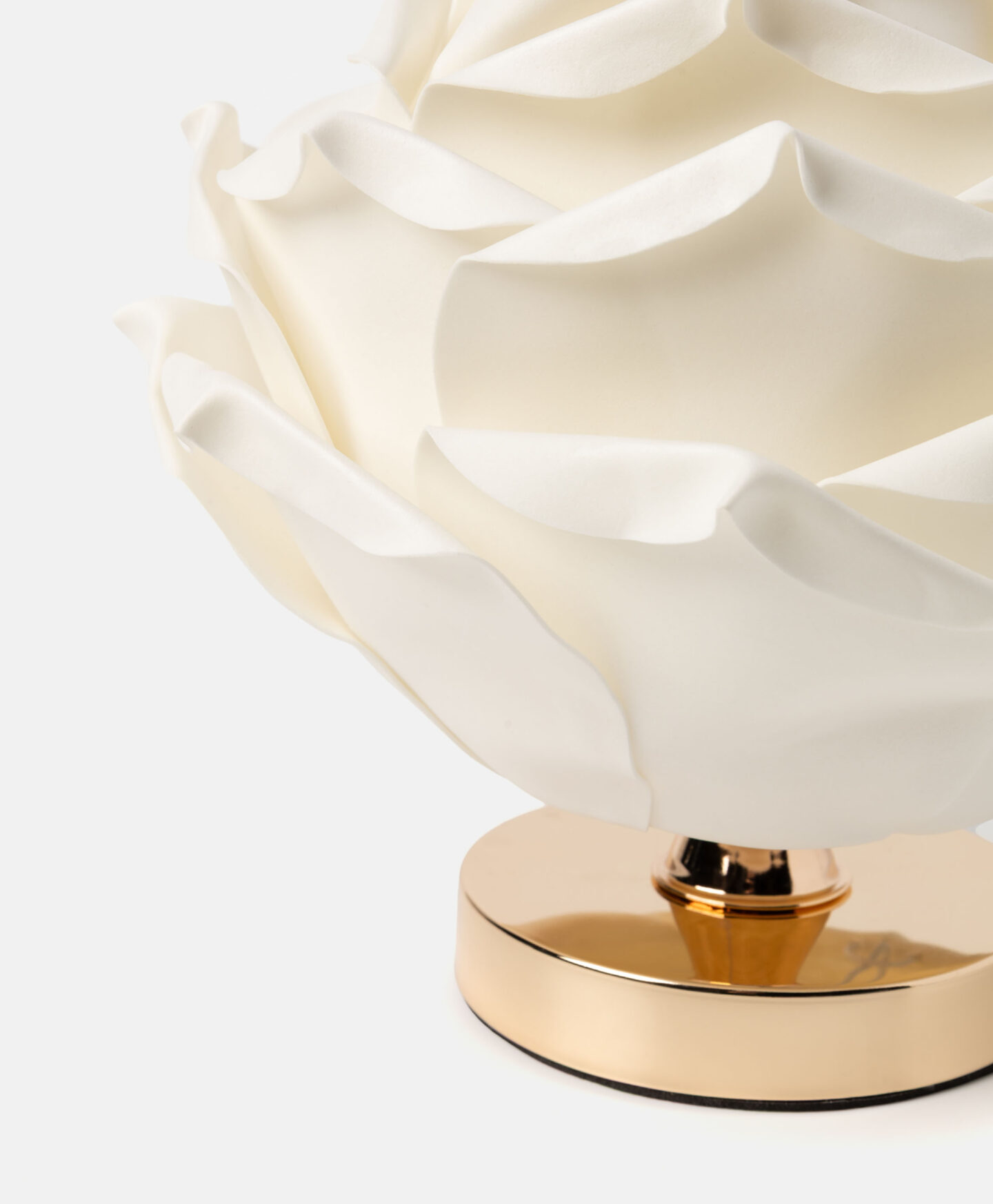La lámpara de mesa con forma de flor destaca por su diseño original. La pantalla recuerda a un capullo cerrado formado por pétalos en tono crema. La base dorada aporta un acabado elegante que encaja en estilos clásicos y modernos. La luz suave crea un ambiente acogedor.