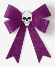El lazo morado con calavera es un detalle original para Halloween. Combina un aire oscuro con elegancia. Hecho de un tejido brillante, reluce de forma increíble a la luz de las velas. Funciona perfecto como adorno en puertas, cortinas o sobre la mesa. Disponible en otros colores.
