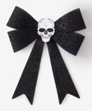 El lazo morado con calavera es un detalle original para Halloween. Combina un aire oscuro con elegancia. Hecho de un tejido brillante, reluce de forma increíble a la luz de las velas. Funciona perfecto como adorno en puertas, cortinas o sobre la mesa. Disponible en otros colores.