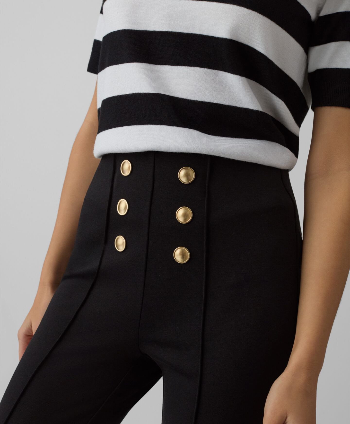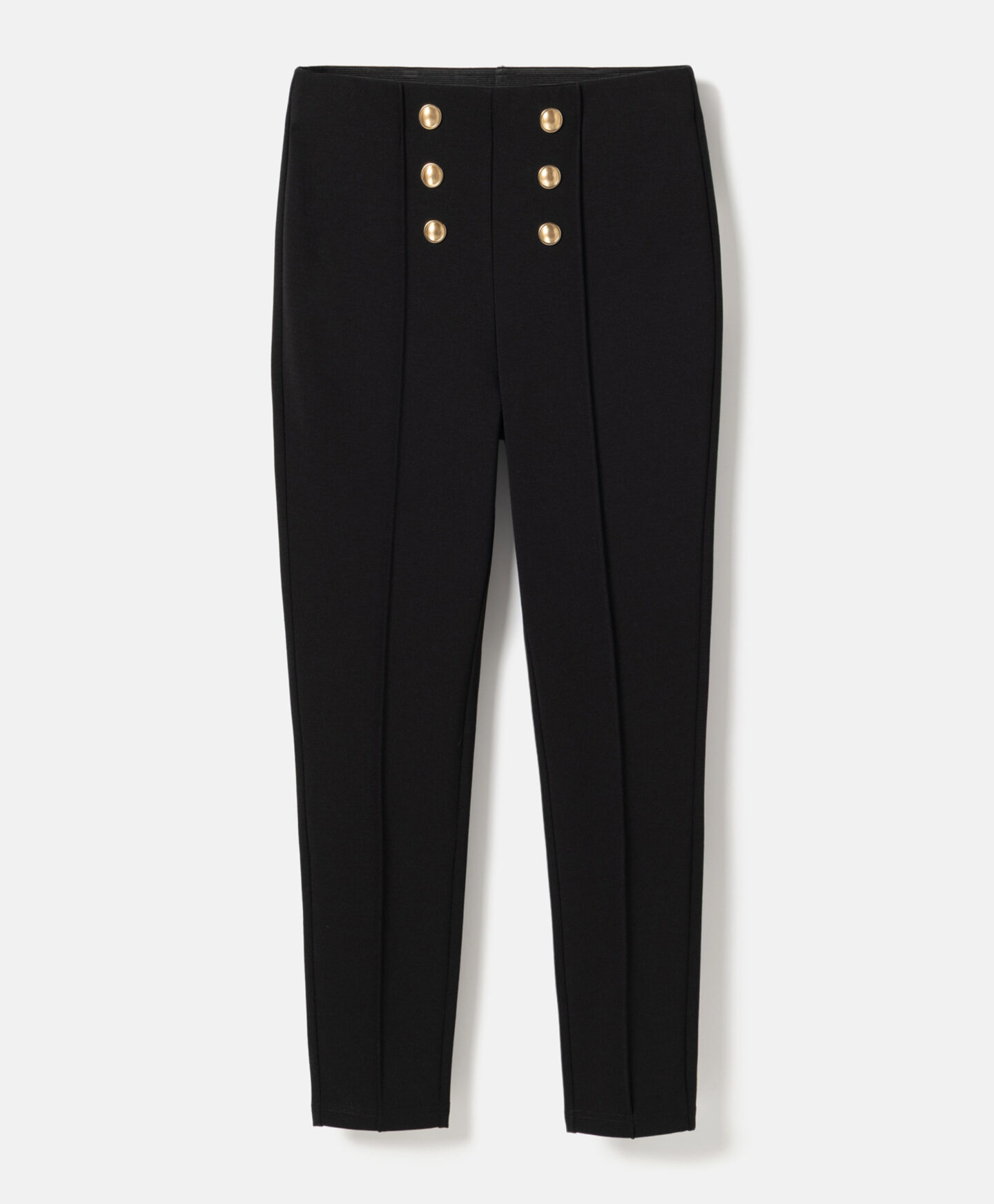 Los leggings con botones decorativos combinan comodidad y un acabado elegante. Gracias a los botones, suman un toque sofisticado. Encajan en looks diarios y también en ocasiones más formales. Además, el tejido elástico asegura un uso cómodo. El corte ajustado marca la silueta.