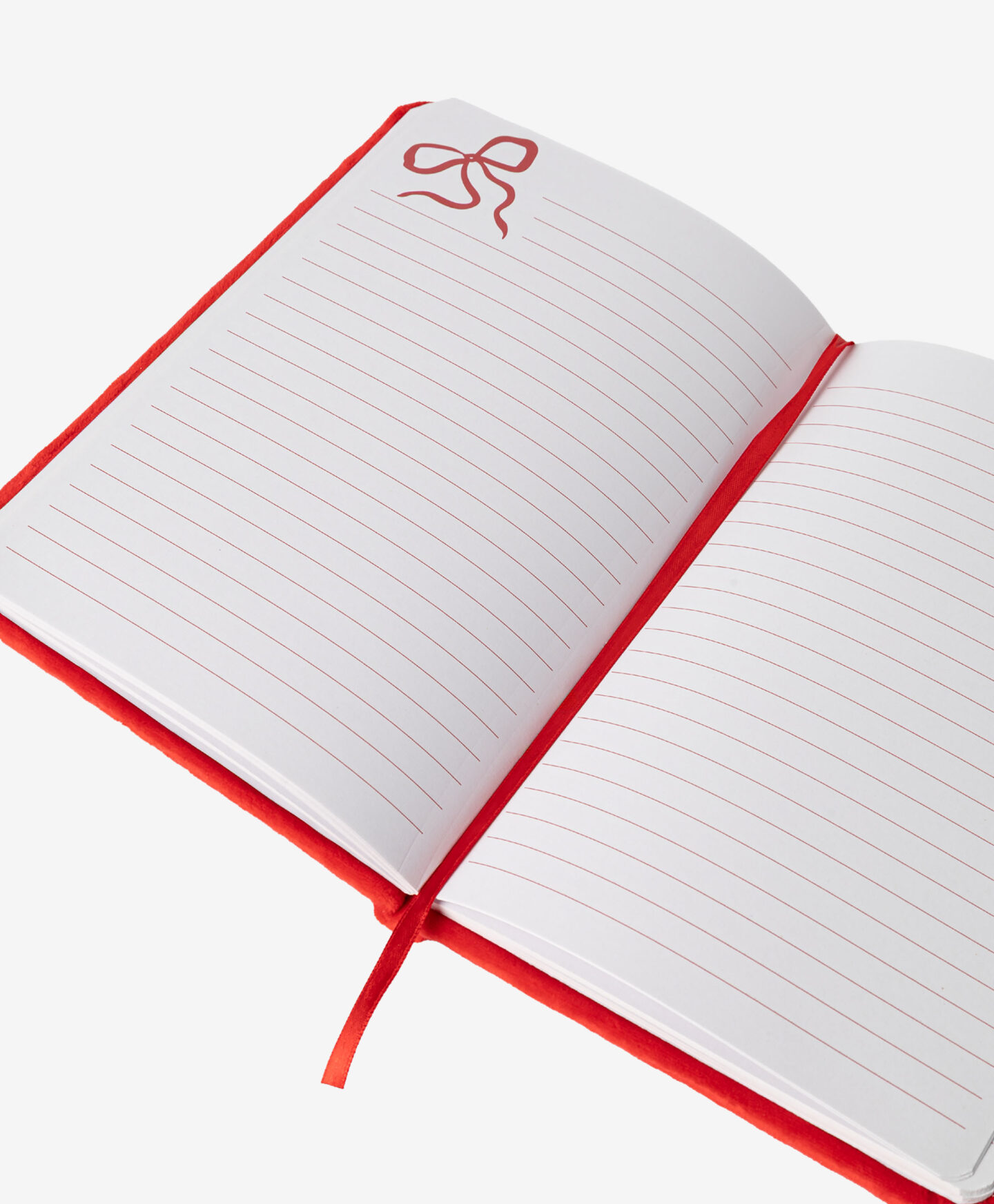 Libreta con lazo y cubierta de terciopelo suave, agradable al tacto. Ideal como diario, cuaderno o bloc de dibujo. Su tamaño compacto permite llevarlo fácilmente en mochilas o bolsos. Una opción elegante para regalar en San Valentín.