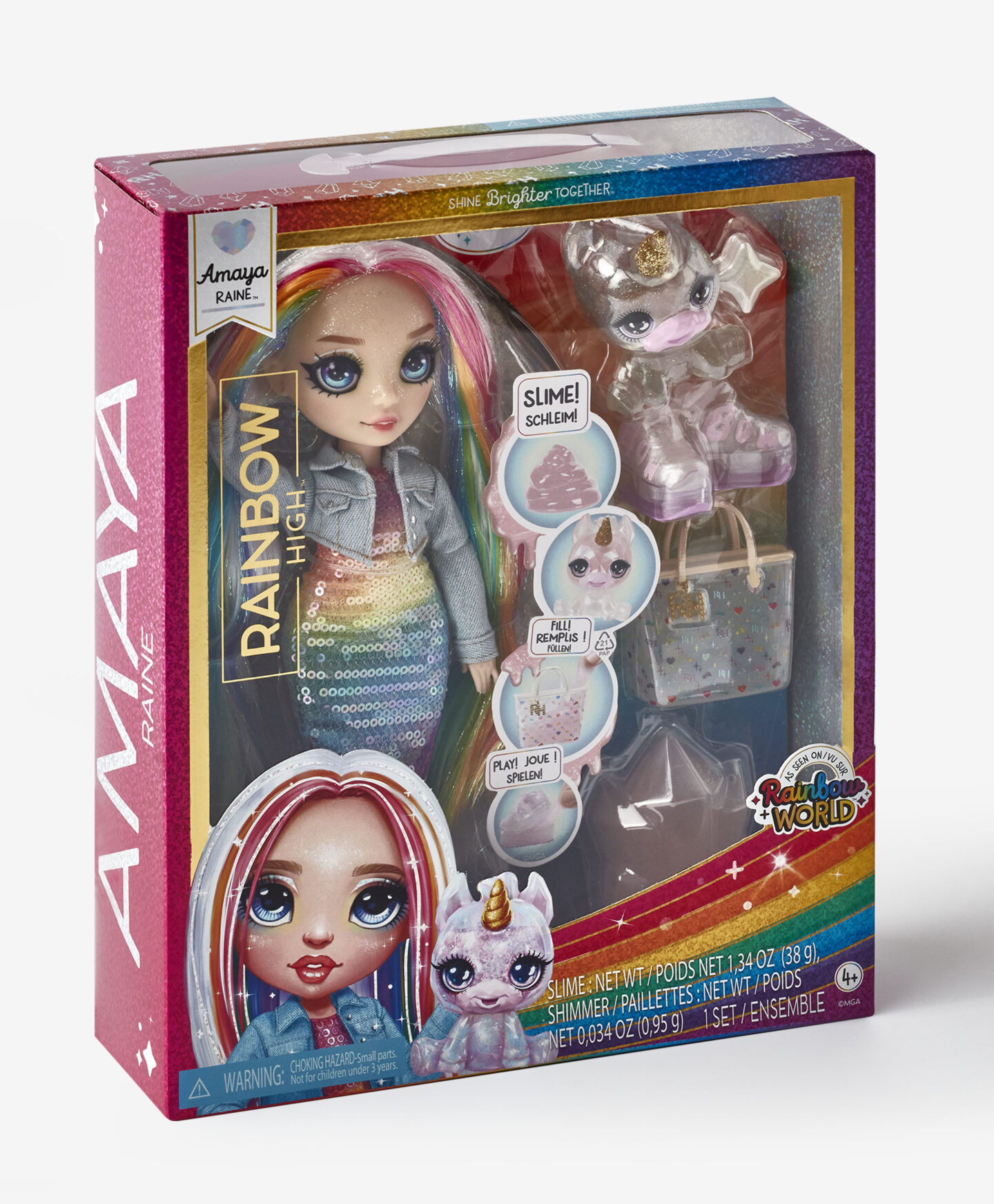 La muñeca Rainbow High Amaya Raine deslumbra con sus colores vivos y su estilo arcoíris tan característico. Su melena larga brilla en muchos tonos, y su conjunto lleno de detalles brillantes le da un toque único. Incluye accesorios como una mascota o slime que hacen el juego más variado. Con ella, los niños pueden dar rienda suelta a su imaginación.