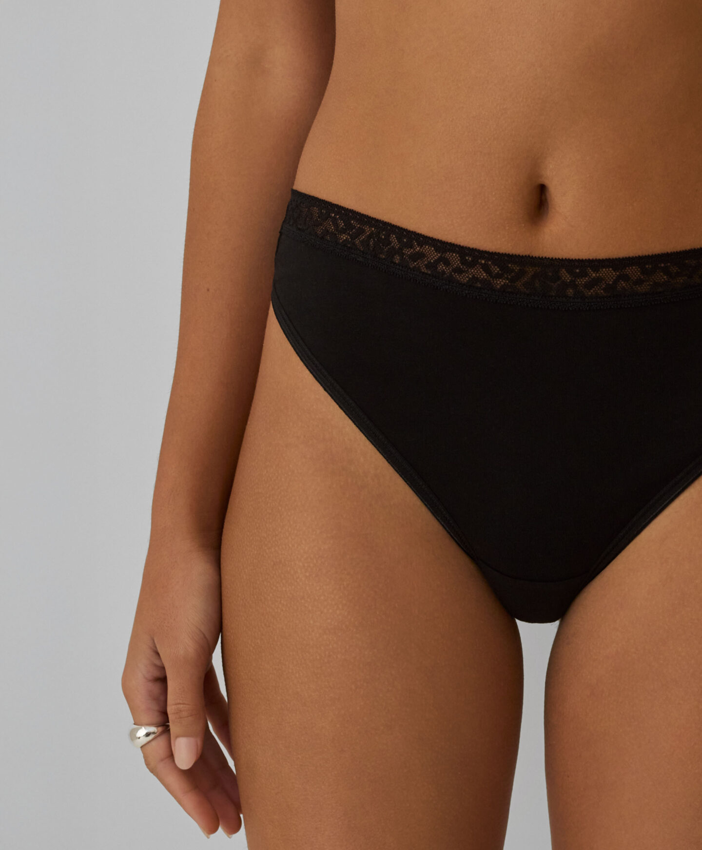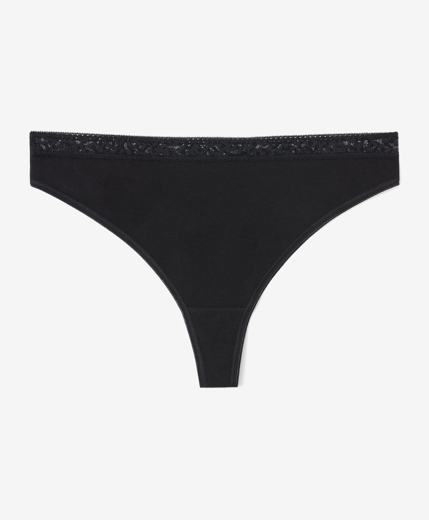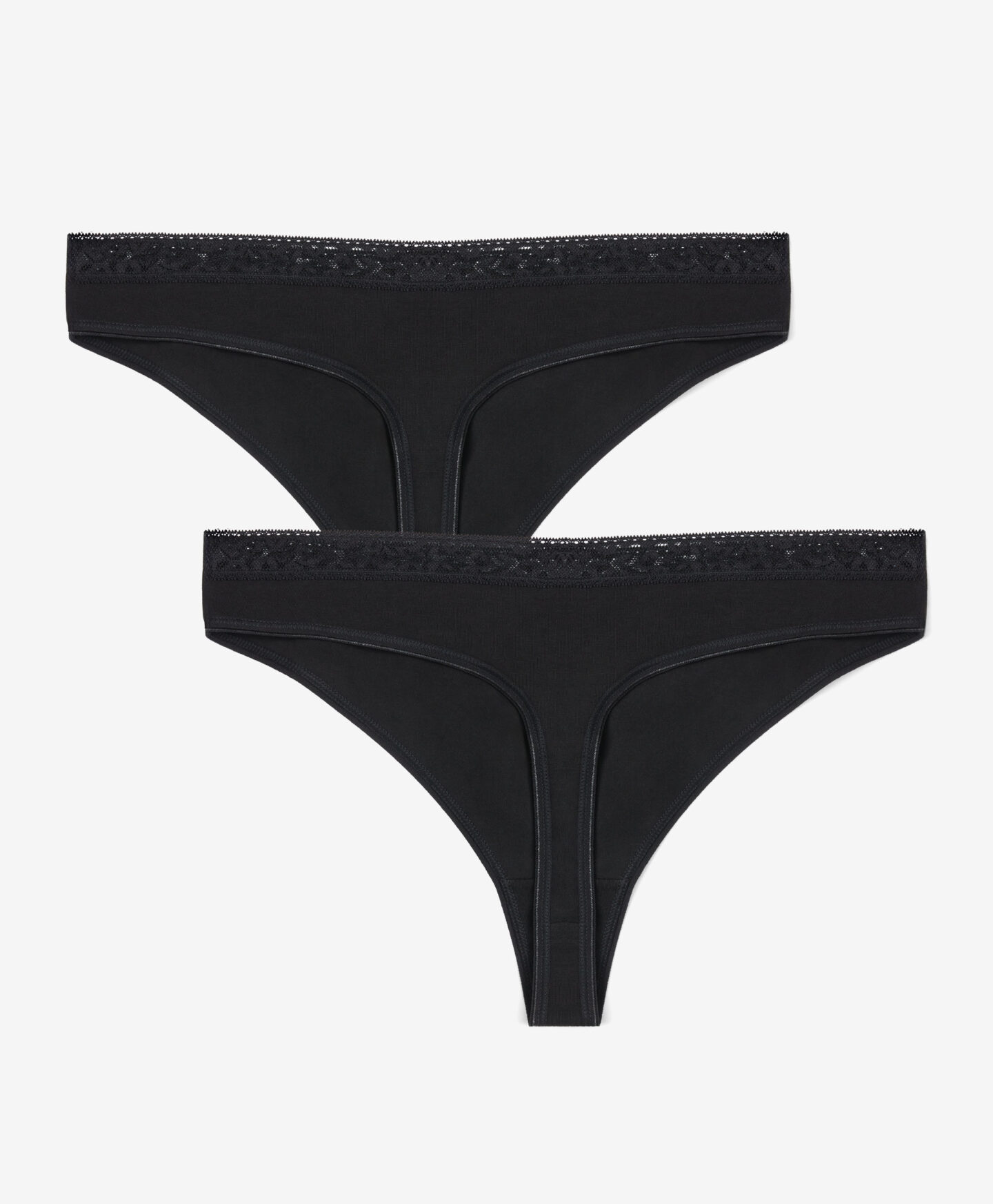 Pack de 2 braguitas tipo thongs con cintura de encaje, perfectas para el día a día. Su alto contenido en algodón y el toque de elastano aportan comodidad. Tienen un corte alto y no se marcan bajo la ropa. Gracias a su tejido, suave y agradable al tacto, se adaptan muy bien al cuerpo.