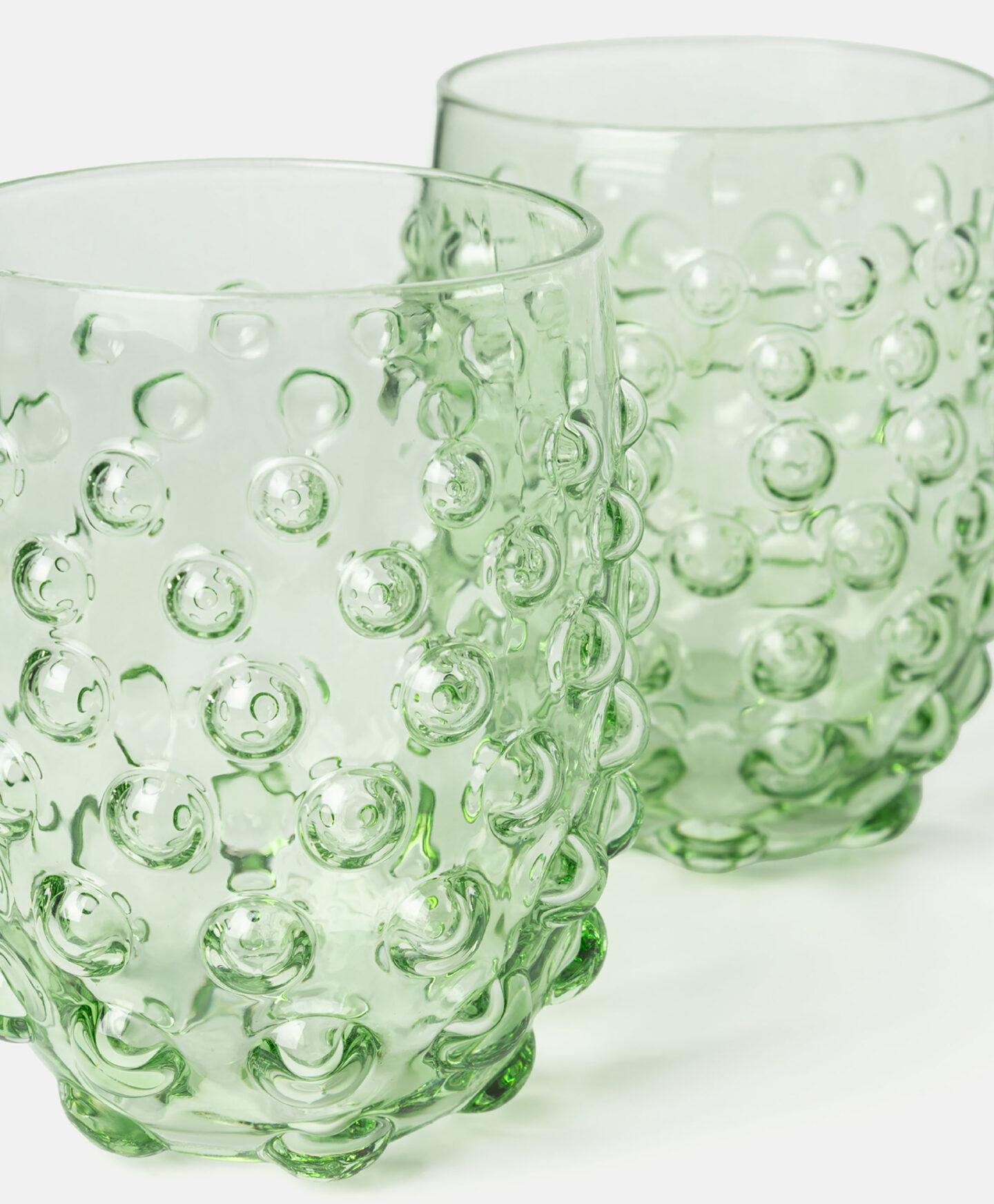 El pack de 2 vasos con textura destaca por su diseño original. El relieve del vidrio crea un efecto visual elegante al reflejar la luz. El vidrio es resistente a arañazos y mantiene el sabor natural de las bebidas. Combina perfectamente con la jarra de vidrio de la misma colección.