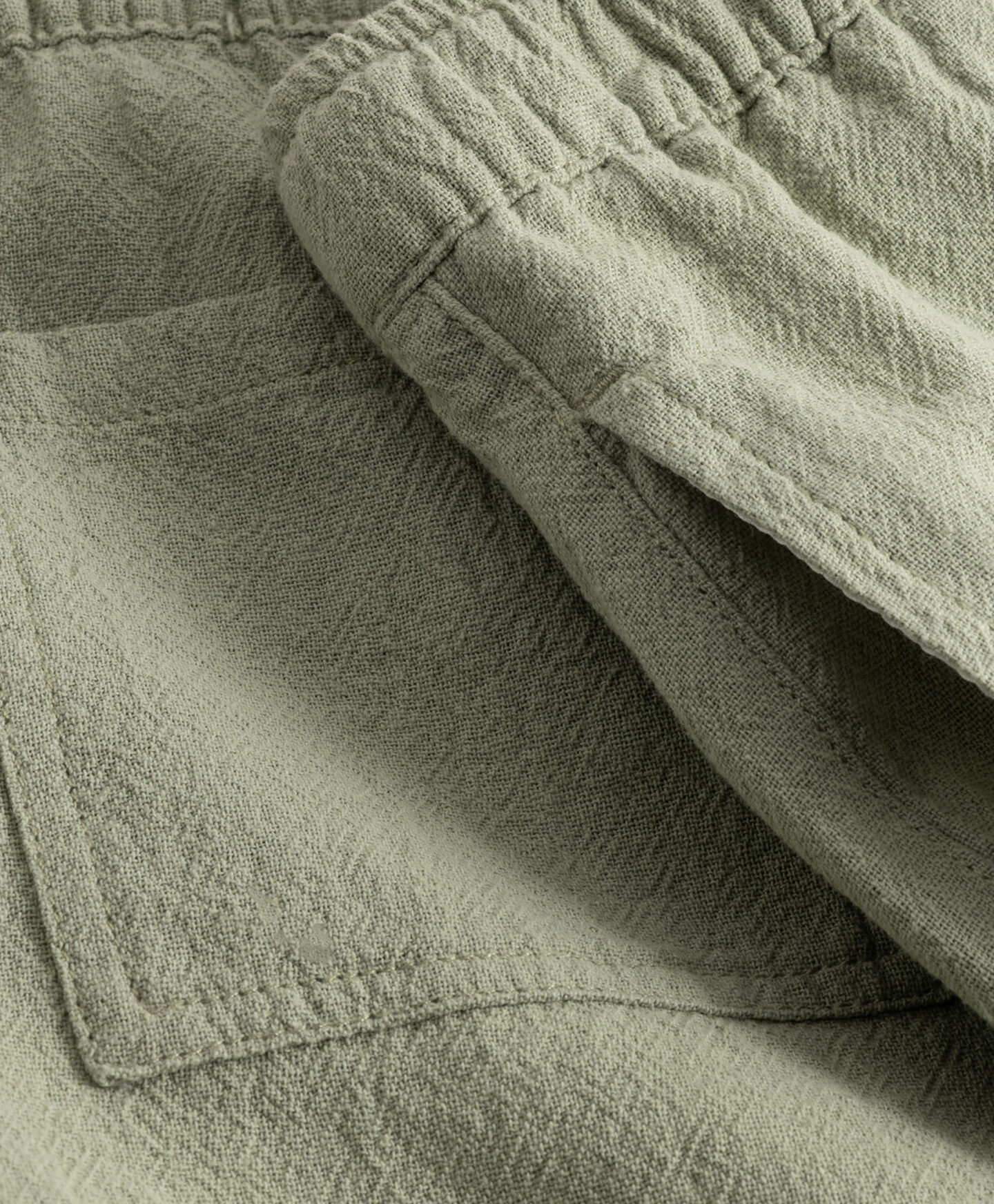 El pantalón corto infantil con efecto texturizado destaca por su comodidad para el día a día. El corte sencillo combina bien con camisetas y camisas ligeras. La mezcla de fibras naturales funciona muy bien en los días cálidos. La cintura elástica aporta libertad de movimiento y los cordones permiten un ajuste cómodo. Una prenda perfecta para actividades diarias o paseos.