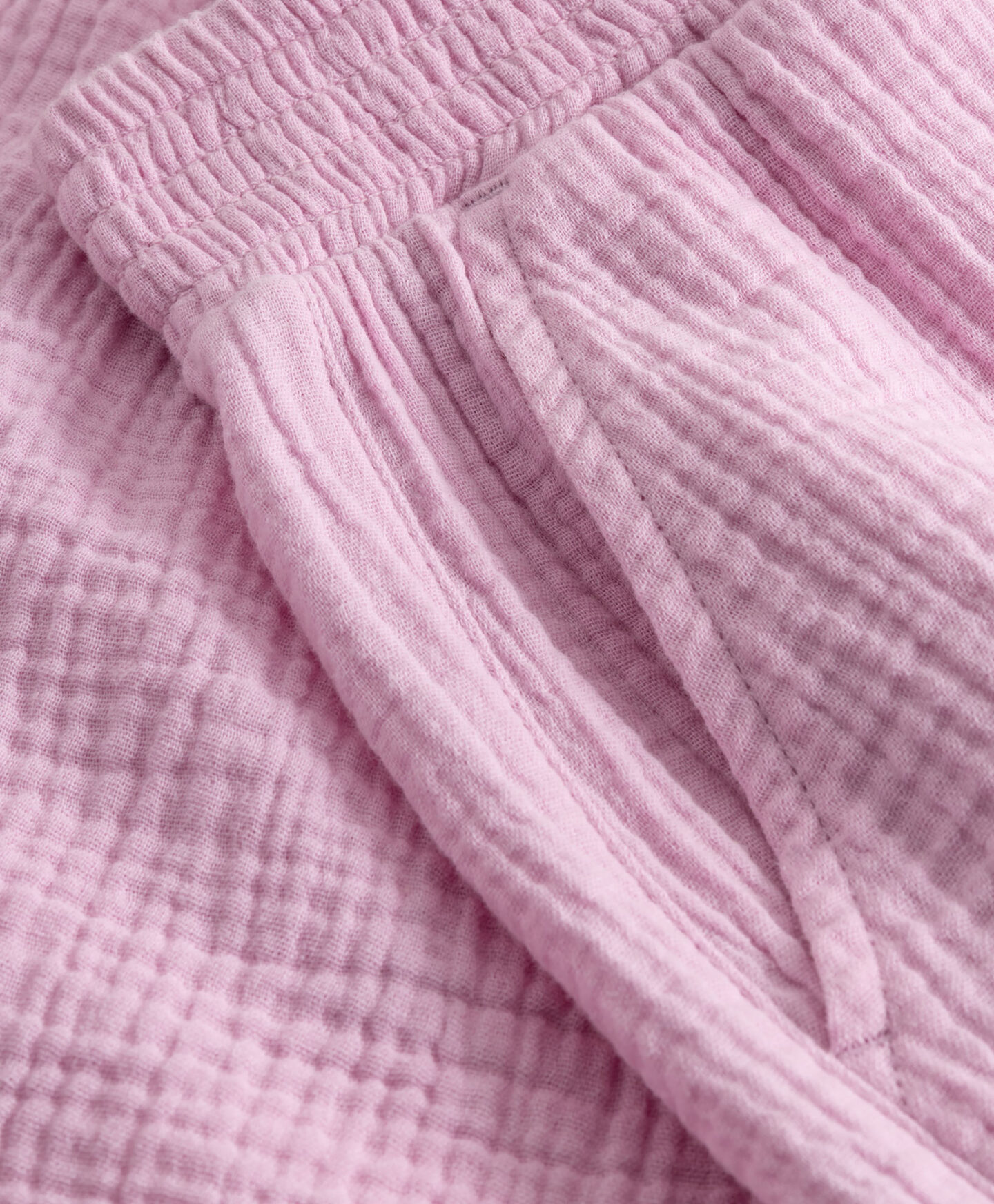 El pantalón corto de muselina 100% algodón es puro espíritu de verano y libertad. La cintura elástica aporta comodidad y se adapta suavemente al abdomen. El tejido natural resulta suave y agradable incluso para pieles sensibles. El tono rosa combina fácilmente con cualquier look veraniego. Perfecto para la playa, paseos al aire libre o escapadas de verano.